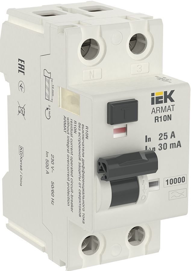 Выключатели дифференциального тока ARMAT серии R10N выполняют функцию защиты поражения человека электрическим током, а так же защиты от пожара при возникновении замыкания на землю. Модельный ряд включает в себя устройства с типами защитных характеристик по дифференциальному току AC, A, AC-S, A-S; номинальными токами от 25 до 100 А; номинальными дифференциальными токами срабатывания от 10 до 300мА. Условная отключающая способность ВДТ ARMAT серии R10N составляет 10 кА.