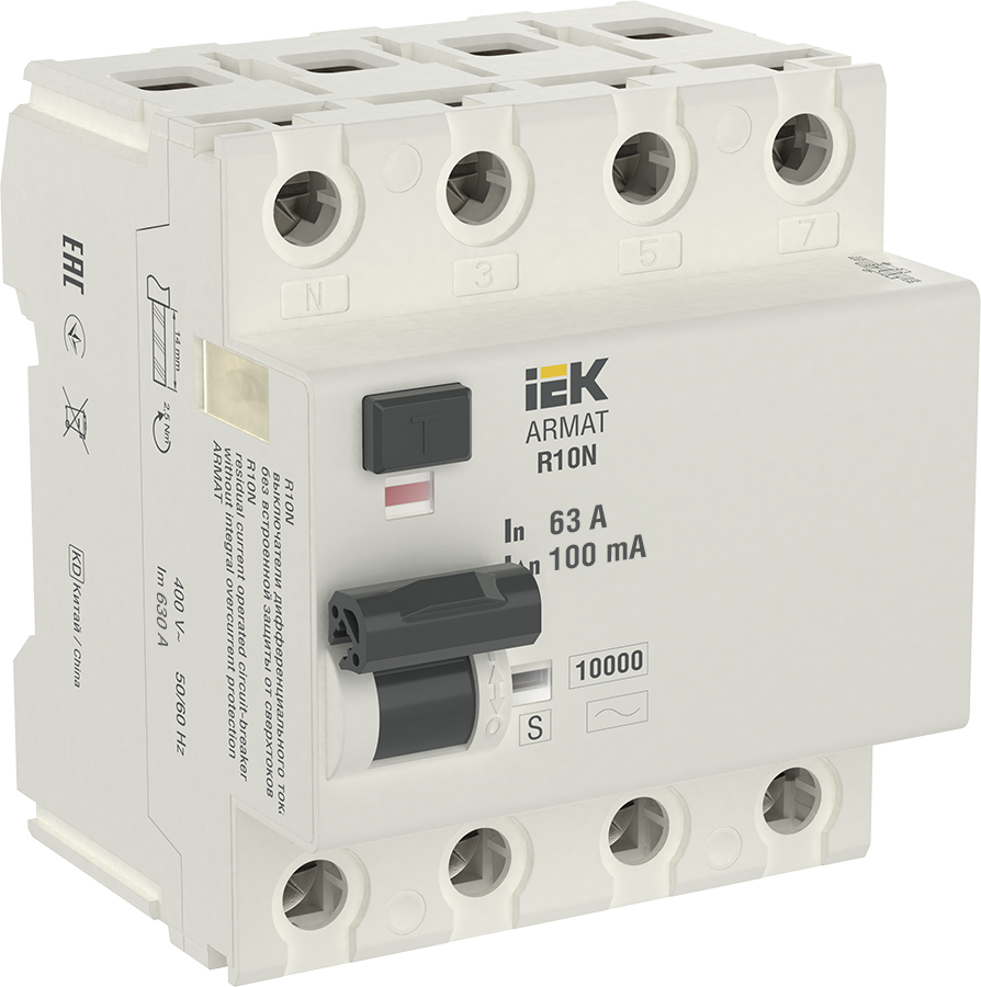 Выключатели дифференциального тока ARMAT серии R10N выполняют функцию защиты поражения человека электрическим током, а так же защиты от пожара при возникновении замыкания на землю. Модельный ряд включает в себя устройства с типами защитных характеристик по дифференциальному току AC, A, AC-S, A-S; номинальными токами от 25 до 100 А; номинальными дифференциальными токами срабатывания от 10 до 300мА. Условная отключающая способность ВДТ ARMAT серии R10N составляет 10 кА.