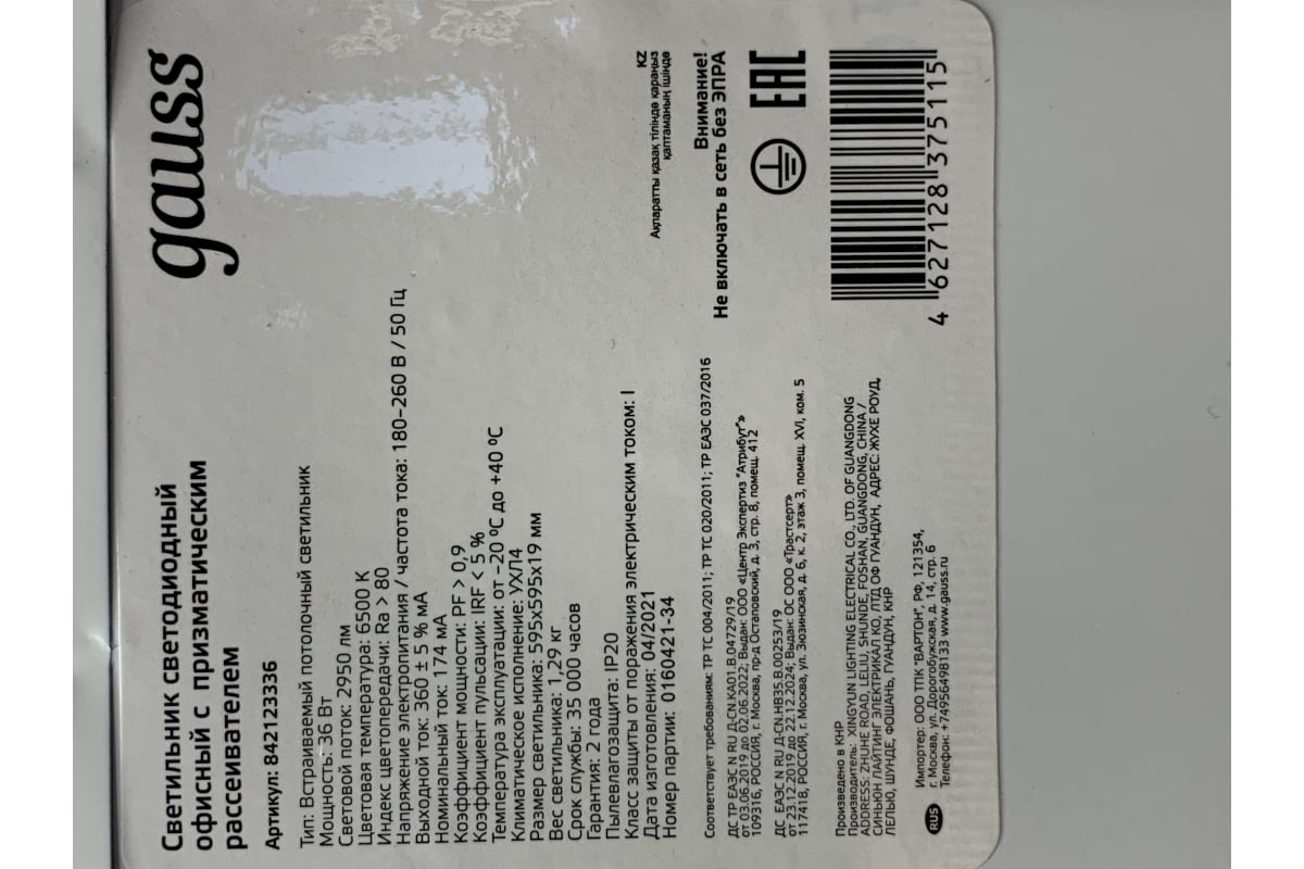 Панель светодиодная Gauss 36W 3300lm 6500K IP20 призма LED / 842123336