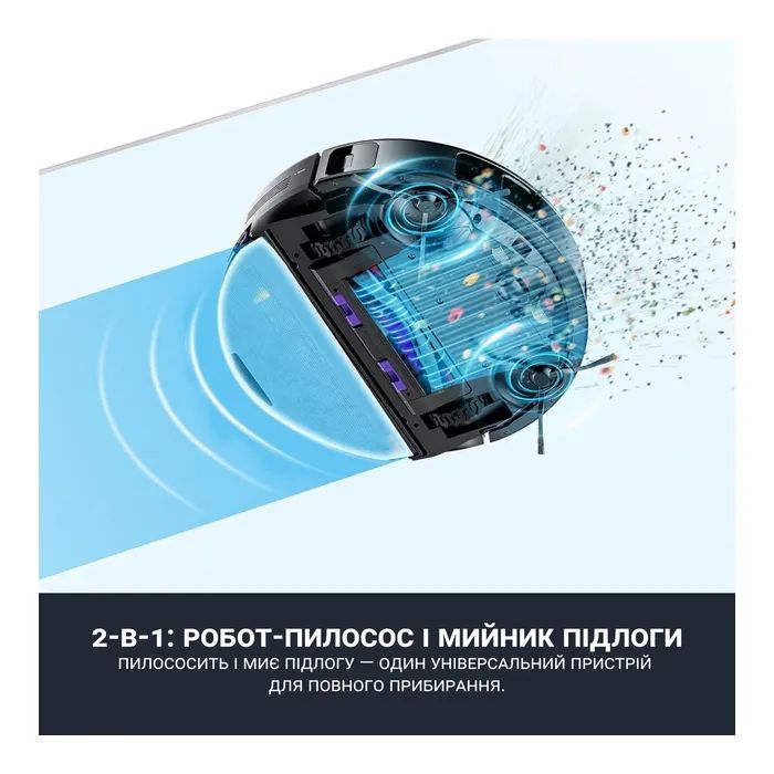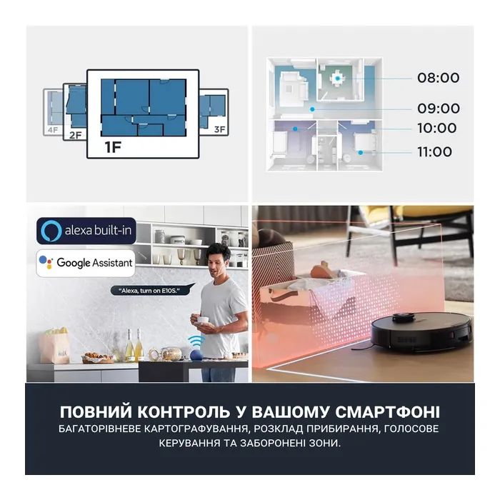 Особливостівстановлення розкладу прибирання , регулювання потужності подачі води , голосові асистенти Amazon Alexa, Google Assistant , автоматична підзарядка (повернення на базу)