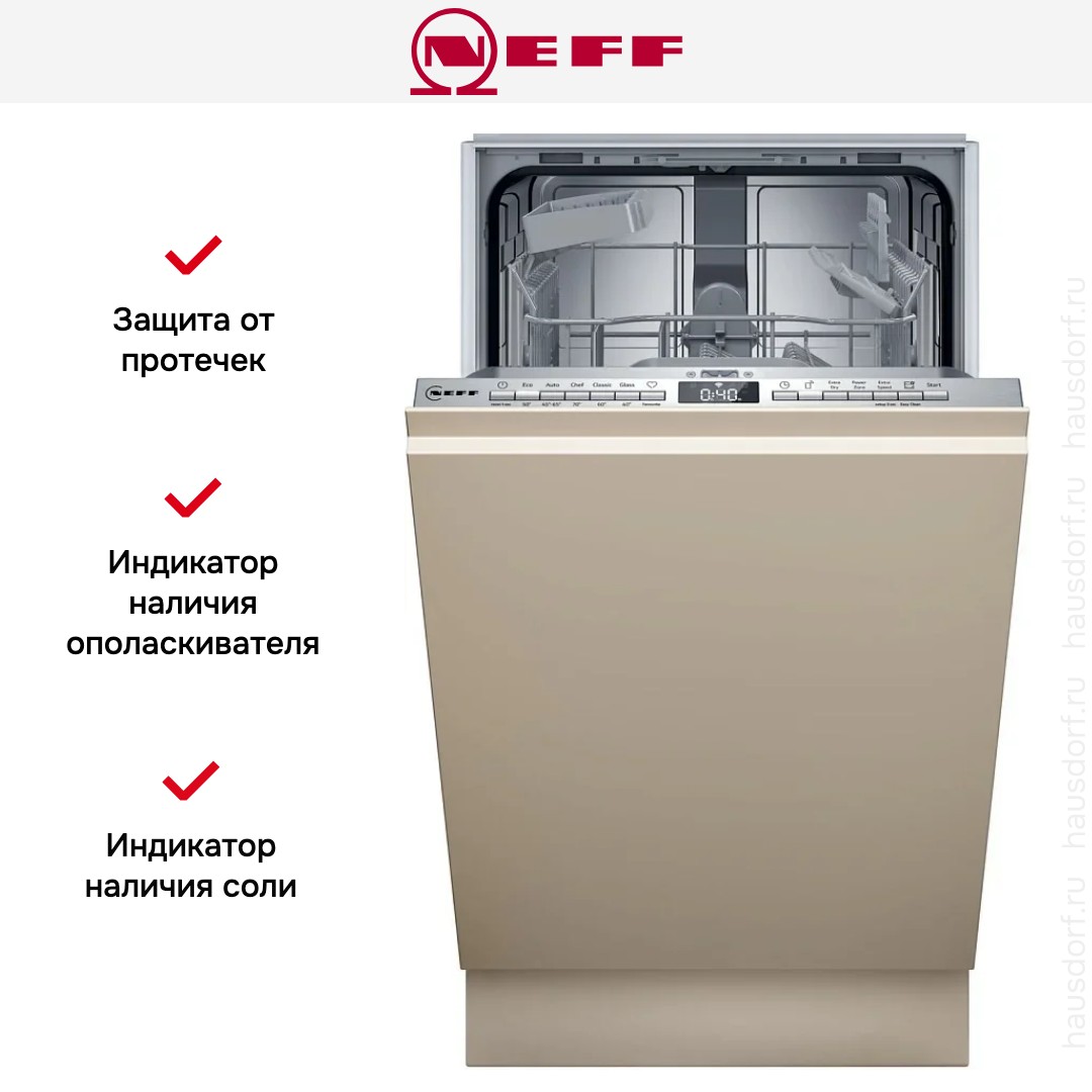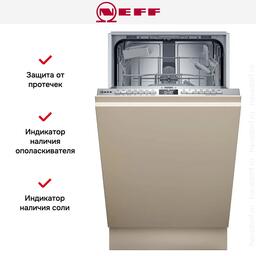 Встраиваемая модель Нефф отлично впишется в любой интерьер, главное — правильно выбрать место, чтобы подвести коммуникации. Устанавливается в нишу целиком, полностью закрывается декоративной панелью. Обратите внимание: в комплекте не идет фасад, его необходимо установить самостоятельно. Имеет уменьшенную ширину — благодаря этому поместится даже на очень маленькой кухне. В камеру можно загрузить ограниченное число комплектов: 10 шт. Комплектом считается набор посуды на одного человека, который нужен для полноценного приема пищи: глубокая и плоская тарелки, тарелка для салата, блюдце под чашку, сама чашка, ложка и вилка.