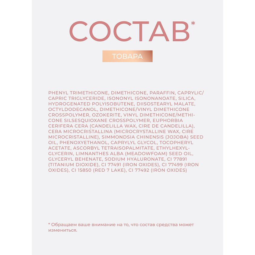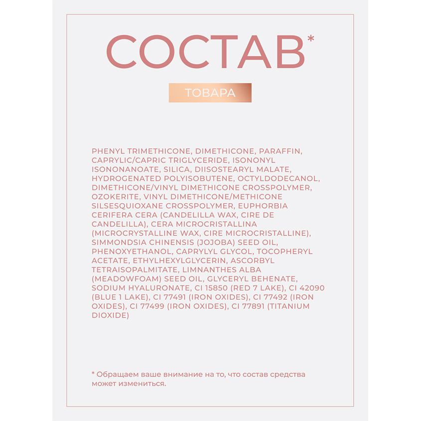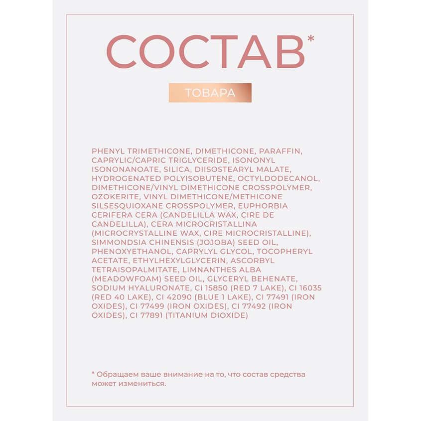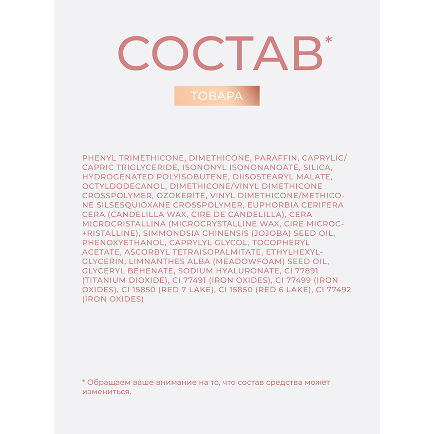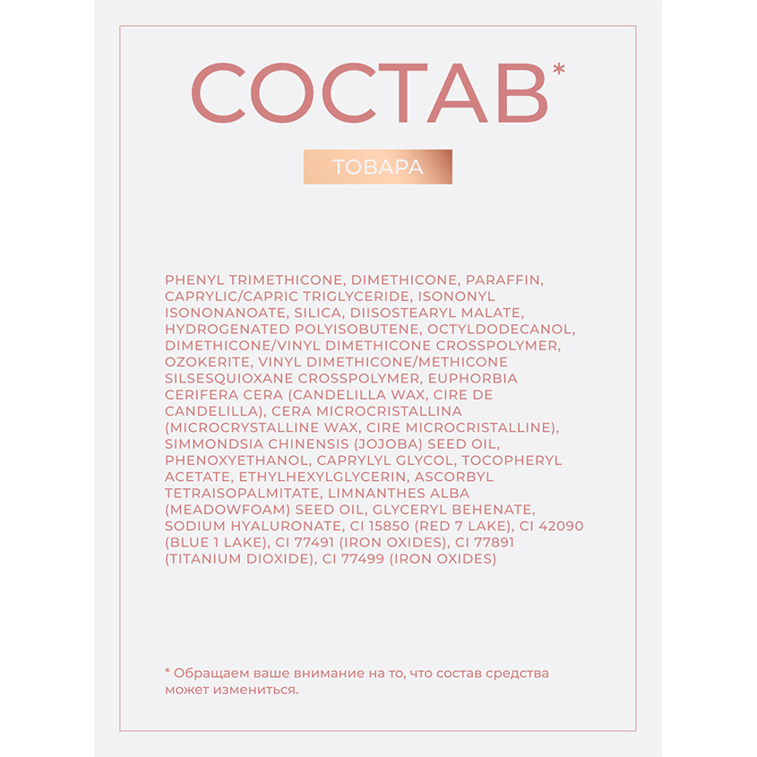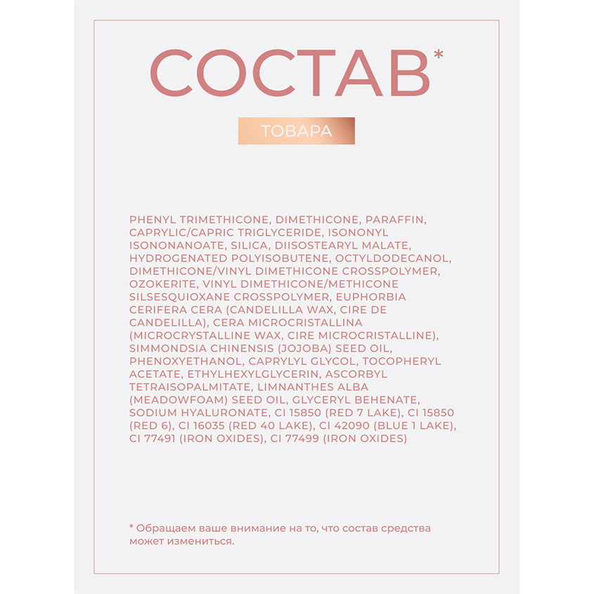 PHENYL TRIMETHICONE, DIMETHICONE, PARAFFIN, CAPRYLIC/CAPRIC TRIGLYCERIDE, ISONONYL ISONONANOATE, SILICA, HYDROGENATED POLYISOBUTENE, DIISOSTEARYL MALATE, OCTYLDODECANOL, DIMETHICONE/VINYL DIMETHICONE CROSSPOLYMER, OZOKERITE, VINYL DIMETHICONE/METHICONE SILSESQUIOXANE CROSSPOLYMER, EUPHORBIA CERIFERA CERA (CANDELILLA WAX, CIRE DE CANDELILLA), CERA MICROCRISTALLINA (MICROCRYSTALLINE WAX, CIRE MICROCRISTALLINE), SIMMONDSIA CHINENSIS (JOJOBA) SEED OIL, PHENOXYETHANOL, CAPRYLYL GLYCOL, TOCOPHERYL ACETATE, ASCORBYL TETRAISOPALMITATE, ETHYLHEXYLGLYCERIN, LIMNANTHES ALBA (MEADOWFOAM) SEED OIL, GLYCERYL BEHENATE, SODIUM HYALURONATE, CI 77891 (TITANIUM DIOXIDE), CI 77491 (IRON OXIDES), CI 77499 (IRON OXIDES), CI 15850 (RED 7 LAKE), CI 15850 (RED 6 LAKE), CI 77492 (IRON OXIDES).