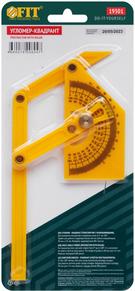 ОсобенностиУгломер-квадрант FIT DIY предназначен для измерения внутренних и наружных углов от 0 до 180 град. при проведении строительных и ремонтных работ.