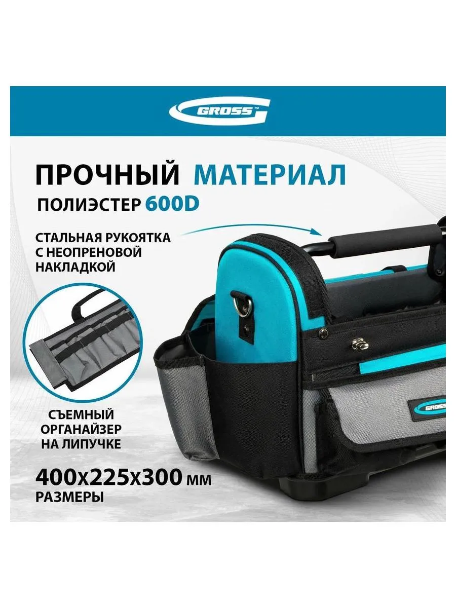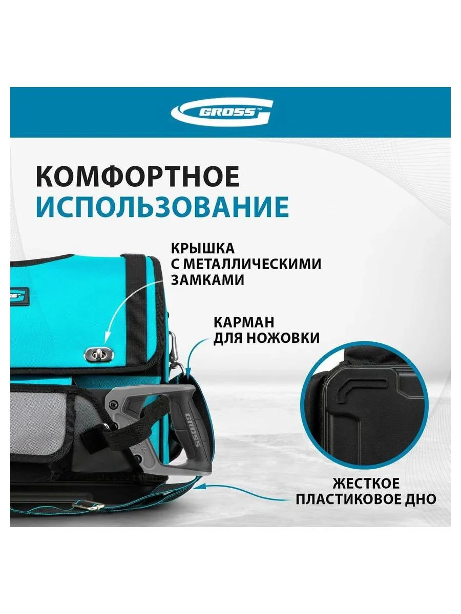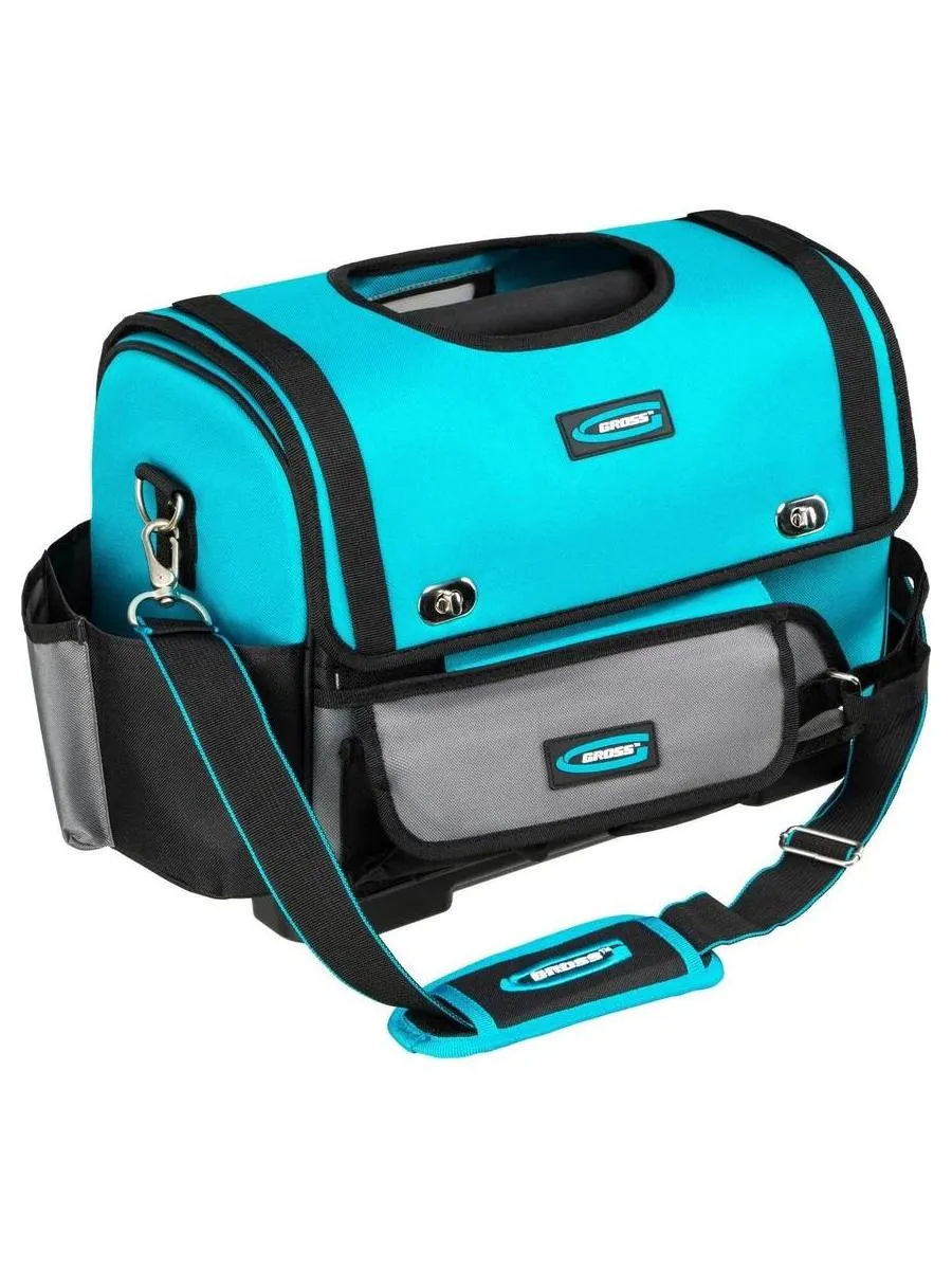 Описание товара Переноска для инструмента, 400х225х300мм, пластиковое дно, наплечный ремень Gross