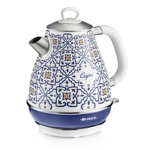 Электрочайник ARIETE Capri обладает необычным рисунком на корпусе и имеет объем 1.7 литра. Мощность нагрева составляет 2200 Вт. Для удобства заливки воды, электрочайник имеет полностью съемную крышку.
