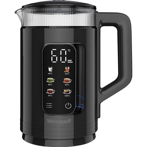 Вместительный и функциональный электрический чайник от Weissgauff, выполненный в черном цвете, обладает объемом 1,5 литра, возможностью нагрева до требуемой температуры в диапазоне от 40 до 100 °C, а также 6 уровнями регулировки нагрева и автоподогрева воды!