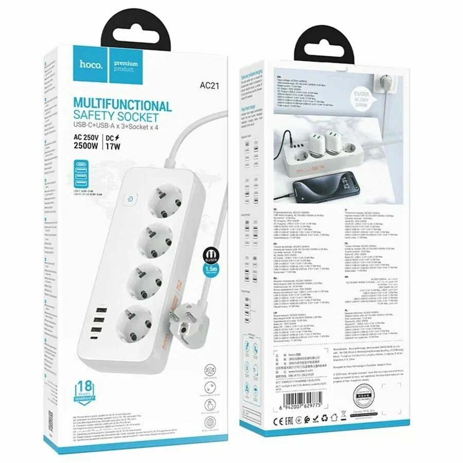 Удлинитель HOCO AC21 Sunlight 4-bit1C3A desktop socket L-1.5M белый