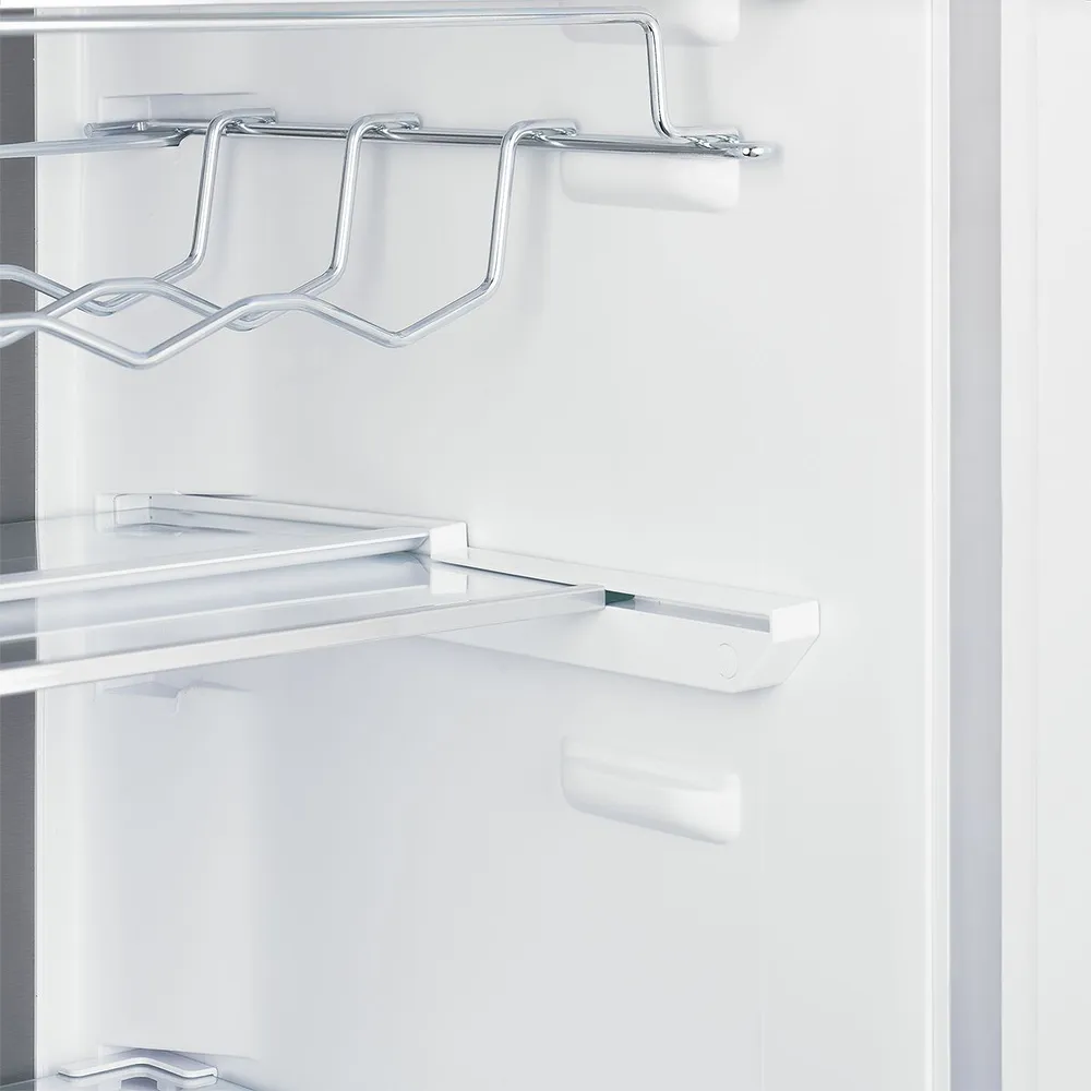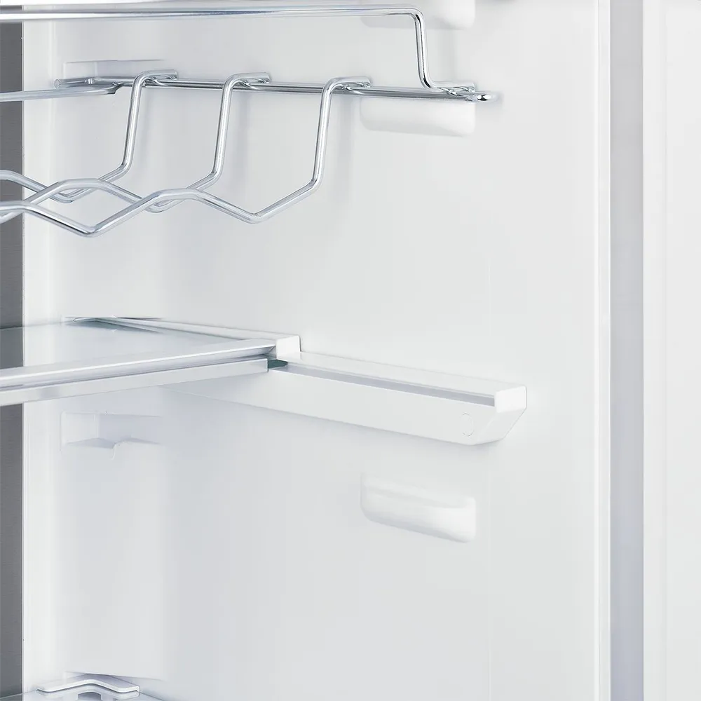 Внутреннее пространство техники эргономично организовано. Всего 4 полки, из которых 2 регулируемые, обеспечивают гибкость в организации пространства. Отделение для бутылок и подставка для яиц добавляют удобство в использовании. Освещение на светодиодных лампах обеспечивает яркое и равномерное освещение всего пространства холодильника.