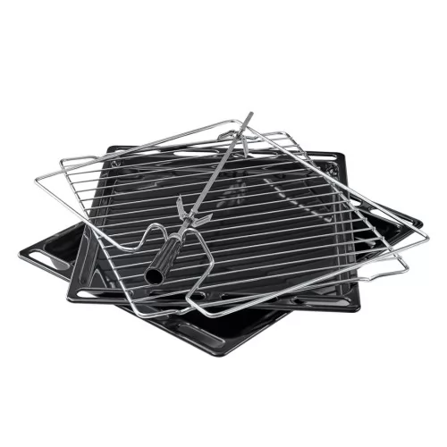 Комплектация- Глубокий противень (40 мм, эмалированная сталь) - Хромированная решётка - Универсальный противень (20 мм, эмалированная сталь) - Вертел - Хромированная рамка для вертела - 2 винта для крепления - Инструкция - Схема монтажа