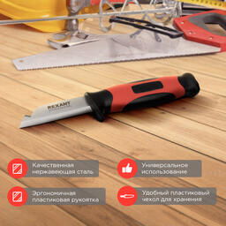Нож монтажный универсальный — это превосходный инструмент, который подойдет для разного вида работ, а также в походах, на рыбалке и во время туризма.Нож изготовлен из прочных и надежных материалов, благодаря чему он обладает повышенным рабочим ресурсом. Лезвие сделано из нержавеющей стали. Незаменим при выполнении отделочных работ.Удобная двухкомпонентная противоскользящая рукоятка обеспечивает комфорт и повышенную безопасность в работе.Нож идет в комплекте с пластиковым чехлом, который удобно крепить к одежде.• Мощная эргономичная двухкомпонентная рукоятка, выполненная из мягкого пластика, обеспечивает дополнительное удобство в работе.• Прецизионная заточка обеспечивает чистоту и точность реза.• Лезвие изготовлено из нержавеющей стали.• Пластиковые ножны для удобного хранения и транспортировки.Характеристики:Длина лезвия: 70 ммОбщая длина ножа: 190 мм