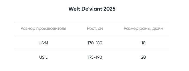 ✅ De'viant — это первый двухподвес для даун-кантри в линейке WELT, который идеально подходит как для крутых подъемов, так и для стремительных спусков. Этот велосипед станет отличным выбором для тех, кто ценит надежность, высокое качество комплектующих и комфорт на технически сложных трассах. Он подходит как для опытных райдеров, так и для новичков, которые только начинают свой путь в мире даун-кантри.✅ Четырёхрычажная конструкция подвески с ходом 120 мм обеспечивает отличную управляемость благодаря основным шарнирам на промышленных подшипниках. Воздушно-масляная вилка также имеет ход 120 мм, который можно увеличить до 140 мм. Регулировка отскока позволяет лучше справляться с неровностями трассы, а блокировка хода снижает потерю энергии при педалировании на ровных участках и при подъёмах.✅ Алюминиевая рама с внутренней проводкой тросов выглядит стильно и защищает их от повреждений и загрязнений. Велосипед оснащён 11-скоростной трансмиссией полупрофессионального класса Microshift XLE, которая отличается надежностью и точностью переключения. Легкая и жесткая система с полым валом повышает эффективность передачи энергии при педалировании. Дисковые гидравлические тормоза обеспечивают отличную работу в любых погодных условиях.✅ Велосипед полностью собран на промышленных подшипниках, что обеспечивает плавное педалирование без лишних усилий. Полые оси создают надежное соединение колес с рамой и вилкой. Широкие пистонированные обода 30 мм добавляют уверенности на поворотах и совместимы с установкой бескамерных покрышек.⚠️ Погружайтесь в мир экстремального катания с De'viant и открывайте новые горизонты уже сегодня!✅ De'viant — это первый двухподвес для даун-кантри в линейке WELT, который идеально подходит как для крутых подъемов, так и для стремительных спусков. Этот велосипед станет отличным выбором для тех, кто ценит надежность, высокое качество комплектующих и комфорт на технически сложных трассах. Он подходит как для опытных райдеров, так и для новичков, которые только начинают свой путь в мире даун-кантри.✅ Четырёхрычажная конструкция подвески с ходом 120 мм обеспечивает отличную управляемость благодаря основным шарнирам на промышленных подшипниках. Воздушно-масляная вилка также имеет ход 120 мм, который можно увеличить до 140 мм. Регулировка отскока позволяет лучше справляться с неровностями трассы, а блокировка хода снижает потерю энергии при педалировании на ровных участках и при подъёмах.✅ Алюминиевая рама с внутренней проводкой тросов выглядит стильно и защищает их от повреждений и загрязнений. Велосипед оснащён 11-скоростной трансмиссией полупрофессионального класса Microshift XLE, которая отличается надежностью и точностью переключения. Легкая и жесткая система с полым валом повышает эффективность передачи энергии при педалировании. Дисковые гидравлические тормоза обеспечивают отличную работу в любых погодных условиях.✅ Велосипед полностью собран на промышленных подшипниках, что обеспечивает плавное педалирование без лишних усилий. Полые оси создают надежное соединение колес с рамой и вилкой. Широкие пистонированные обода 30 мм добавляют уверенности на поворотах и совместимы с установкой бескамерных покрышек.⚠️ Погружайтесь в мир экстремального катания с De'viant и открывайте новые горизонты уже сегодня!
