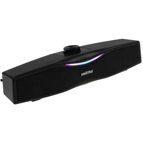 Саундбар для компьютера Smartbuy FORTUNE черного цвета подключается к источнику звука с помощью разъема jack 3.5 мм. Питание осуществляется от USB Type-A. Громкость регулируется с помощью механического регулятора на корпусе.
