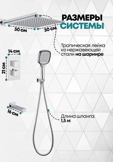 ✅ Уникальная душевая система с тропическим душем и термостатом станет настоящим украшением вашей ванной комнаты, создавая атмосферу релаксации и комфорта. Этот комплект включает в себя все необходимое для установки: корпус душевой системы, термостатический картридж от Vernet (Франция), ручную лейку из латуни, верхний тропический душ с регулируемым углом наклона и несколькими режимами подачи воды.✅ Если вы ищете смеситель для ванны с душем или душ со смесителем, эта модель идеально подойдет для вас. Она обеспечит вам расслабляющие душевые процедуры и добавит уют в ваш дом. Стильный и функциональный дизайн этой душевой системы позволит вам наслаждаться каждым моментом.⚠️ Смесители «Grocenberg» изготовлены из санитарной латуни с высоким содержанием меди (70%), что гарантирует их долговечность. Перед отправкой каждый продукт проходит контрольное тестирование, что подтверждает его надежность. Литой корпус выдерживает давление в 3 раза больше стандартного, что обеспечивает долгий срок службы без протечек.✅ Эргономичный дизайн и плавный ход рычага делают использование этой душевой системы максимально комфортным. В комплект входят все необходимые элементы: смеситель с термостатическим картриджем, фиксированный излив, ручная лейка с тремя режимами, шланг, верхний тропический душ и монтажный комплект.✅ Эта душевая система станет стильным и ярким акцентом в вашем интерьере. Прямая продажа от завода-производителя Grocenberg гарантирует высокое качество и надежность. Все товары упакованы в прочные коробки с защитой, что обеспечивает их идеальное состояние при доставке.✅ Уникальная душевая система с тропическим душем и термостатом станет настоящим украшением вашей ванной комнаты, создавая атмосферу релаксации и комфорта. Этот комплект включает в себя все необходимое для установки: корпус душевой системы, термостатический картридж от Vernet (Франция), ручную лейку из латуни, верхний тропический душ с регулируемым углом наклона и несколькими режимами подачи воды.✅ Если вы ищете смеситель для ванны с душем или душ со смесителем, эта модель идеально подойдет для вас. Она обеспечит вам расслабляющие душевые процедуры и добавит уют в ваш дом. Стильный и функциональный дизайн этой душевой системы позволит вам наслаждаться каждым моментом.⚠️ Смесители «Grocenberg» изготовлены из санитарной латуни с высоким содержанием меди (70%), что гарантирует их долговечность. Перед отправкой каждый продукт проходит контрольное тестирование, что подтверждает его надежность. Литой корпус выдерживает давление в 3 раза больше стандартного, что обеспечивает долгий срок службы без протечек.✅ Эргономичный дизайн и плавный ход рычага делают использование этой душевой системы максимально комфортным. В комплект входят все необходимые элементы: смеситель с термостатическим картриджем, фиксированный излив, ручная лейка с тремя режимами, шланг, верхний тропический душ и монтажный комплект.✅ Эта душевая система станет стильным и ярким акцентом в вашем интерьере. Прямая продажа от завода-производителя Grocenberg гарантирует высокое качество и надежность. Все товары упакованы в прочные коробки с защитой, что обеспечивает их идеальное состояние при доставке.