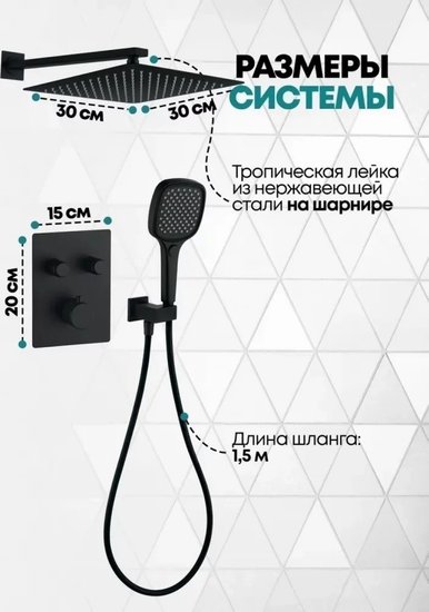 ✅ Уникальная душевая система с тропическим душем и термостатом создаст атмосферу релаксации в вашей ванной комнате. Этот комплект включает в себя все необходимые элементы для комфортного использования: корпус душевой системы, термостатический картридж от Vernet (Франция), ручную лейку из латуни, верхний тропический душ с регулируемым углом наклона и несколькими режимами подачи воды.✅ Если вы ищете смеситель для ванны с душем или душ со смесителем, эта модель станет отличным выбором. Она не только функциональна, но и добавит стильный акцент в ваш интерьер. Наслаждайтесь расслабляющими процедурами и создайте уют в своем доме с помощью этой душевой системы.✅ Смесители «Grocenberg» изготовлены из санитарной латуни с высоким содержанием меди (70%). При производстве используются передовые технологии, включая двойное никель-хром гальваническое покрытие и порошковую окраску. Каждое изделие проходит контрольное тестирование, что гарантирует надежность и долговечность.⚠️ Литой корпус системы выдерживает давление в 3 раза больше стандартного, что обеспечивает долгий срок службы без протечек. Ожидайте до 30 лет комфортной эксплуатации.✅ Эргономичный дизайн и плавный ход рычага делают использование системы максимально удобным. В комплект входят все необходимые элементы: смеситель с термостатом, ручная лейка, держатель, шланг, верхний тропический душ и монтажный комплект.✅ Вес системы составляет 6,7 кг в упаковке и 6 кг без нее. Каждое изделие упаковано в прочные коробки с защитой из поролона, что гарантирует его идеальное состояние при доставке.✅ Уникальная душевая система с тропическим душем и термостатом создаст атмосферу релаксации в вашей ванной комнате. Этот комплект включает в себя все необходимые элементы для комфортного использования: корпус душевой системы, термостатический картридж от Vernet (Франция), ручную лейку из латуни, верхний тропический душ с регулируемым углом наклона и несколькими режимами подачи воды.✅ Если вы ищете смеситель для ванны с душем или душ со смесителем, эта модель станет отличным выбором. Она не только функциональна, но и добавит стильный акцент в ваш интерьер. Наслаждайтесь расслабляющими процедурами и создайте уют в своем доме с помощью этой душевой системы.✅ Смесители «Grocenberg» изготовлены из санитарной латуни с высоким содержанием меди (70%). При производстве используются передовые технологии, включая двойное никель-хром гальваническое покрытие и порошковую окраску. Каждое изделие проходит контрольное тестирование, что гарантирует надежность и долговечность.⚠️ Литой корпус системы выдерживает давление в 3 раза больше стандартного, что обеспечивает долгий срок службы без протечек. Ожидайте до 30 лет комфортной эксплуатации.✅ Эргономичный дизайн и плавный ход рычага делают использование системы максимально удобным. В комплект входят все необходимые элементы: смеситель с термостатом, ручная лейка, держатель, шланг, верхний тропический душ и монтажный комплект.✅ Вес системы составляет 6,7 кг в упаковке и 6 кг без нее. Каждое изделие упаковано в прочные коробки с защитой из поролона, что гарантирует его идеальное состояние при доставке.