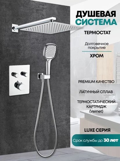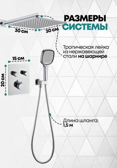 ✅ Уникальная душевая система с тропическим душем и термостатом станет настоящим украшением вашей ванной комнаты. Этот комплект включает в себя все необходимое для комфортного использования: корпус душевой системы, термостатический картридж от Vernet (Франция), ручную лейку из латуни, верхний тропический душ с регулируемым углом наклона и несколькими режимами подачи воды.✅ Если вы ищете смеситель для ванны с душем, то эта модель идеально подойдет для вас. Она создаст атмосферу уюта и расслабления, позволяя наслаждаться приятными водными процедурами. Благодаря высококачественным материалам и современным технологиям, душевой комплект прослужит вам долгие годы.⚠️ Обратите внимание на надежность конструкции: смесители «Grocenberg» изготавливаются из санитарной латуни с высоким содержанием меди, а двойное никель-хром гальваническое покрытие обеспечивает долговечность и устойчивость к коррозии. ✅ Эргономичный дизайн и плавный ход рычага делают использование системы максимально комфортным. В комплект входят все необходимые элементы: ручная лейка с тремя режимами, шланг длиной 1,5 м, верхний тропический душ размером 30х30 см и монтажный комплект.✅ Душевая система Grocenberg — это стильное и функциональное решение для вашего интерьера. Прямые поставки от завода-производителя гарантируют высокое качество и надежность. Убедитесь сами, что ваша ванная комната может стать настоящим оазисом комфорта!✅ Уникальная душевая система с тропическим душем и термостатом станет настоящим украшением вашей ванной комнаты. Этот комплект включает в себя все необходимое для комфортного использования: корпус душевой системы, термостатический картридж от Vernet (Франция), ручную лейку из латуни, верхний тропический душ с регулируемым углом наклона и несколькими режимами подачи воды.✅ Если вы ищете смеситель для ванны с душем, то эта модель идеально подойдет для вас. Она создаст атмосферу уюта и расслабления, позволяя наслаждаться приятными водными процедурами. Благодаря высококачественным материалам и современным технологиям, душевой комплект прослужит вам долгие годы.⚠️ Обратите внимание на надежность конструкции: смесители «Grocenberg» изготавливаются из санитарной латуни с высоким содержанием меди, а двойное никель-хром гальваническое покрытие обеспечивает долговечность и устойчивость к коррозии. ✅ Эргономичный дизайн и плавный ход рычага делают использование системы максимально комфортным. В комплект входят все необходимые элементы: ручная лейка с тремя режимами, шланг длиной 1,5 м, верхний тропический душ размером 30х30 см и монтажный комплект.✅ Душевая система Grocenberg — это стильное и функциональное решение для вашего интерьера. Прямые поставки от завода-производителя гарантируют высокое качество и надежность. Убедитесь сами, что ваша ванная комната может стать настоящим оазисом комфорта!