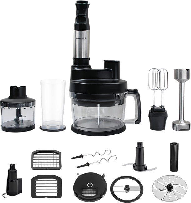 - В комплекте насадка-блендер, чаша (2 шт.), венчик (2 шт.), насадка для замешивания теста (2 шт.), измельчитель (2 шт.), крюк для теста, насадка для нарезки кубиками, насадка для нарезки картофеля фри, нож (для нарезки), крышка к стакану, мерный стакан, толкатель, книга рецептов, диск для терки и шинковки