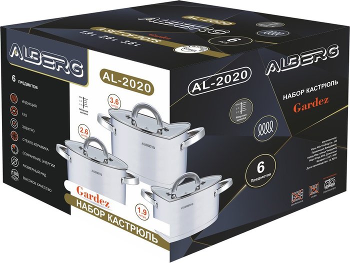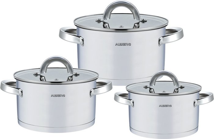 Состав набораСостав набора кастрюль:- 3 кастрюли:- Кастрюля 1: 1.9 л (Ø16 х 9.5 см)- Кастрюля 2: 2.6 л (Ø18 х 10.5 см)- Кастрюля 3: 3.6 л (Ø20 х 11.5 см)- 3 крышки из жаропрочного стекла.