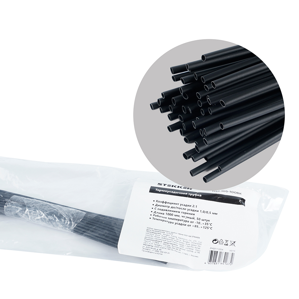 Термоусадочные трубки STEKKER HST-105-100BK, длина 1000мм. 50шт. в наборе, цвет: черный. Коэффициент усадки 2:1, диапазон рабочих температур -10..+35°C, температура усадки +85..+125°C, номинальный ток 32А, для проводов сечением мм2.