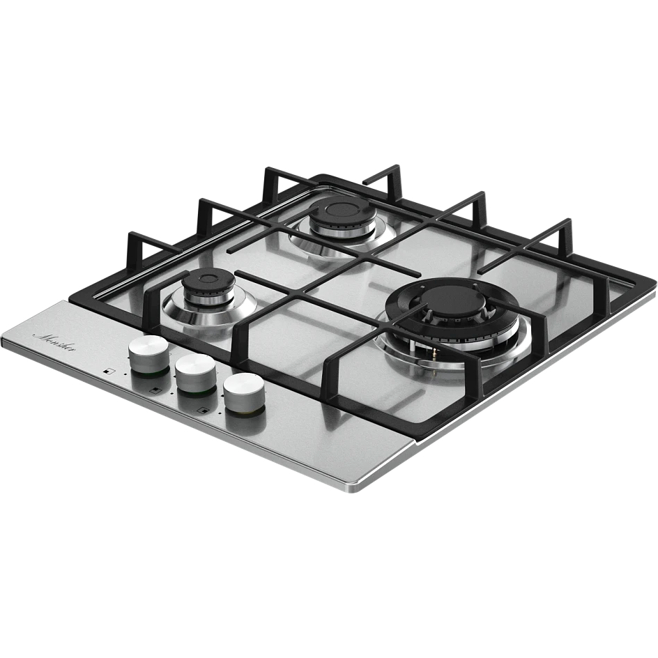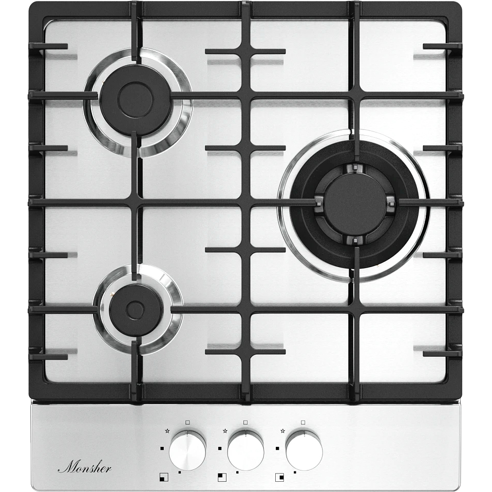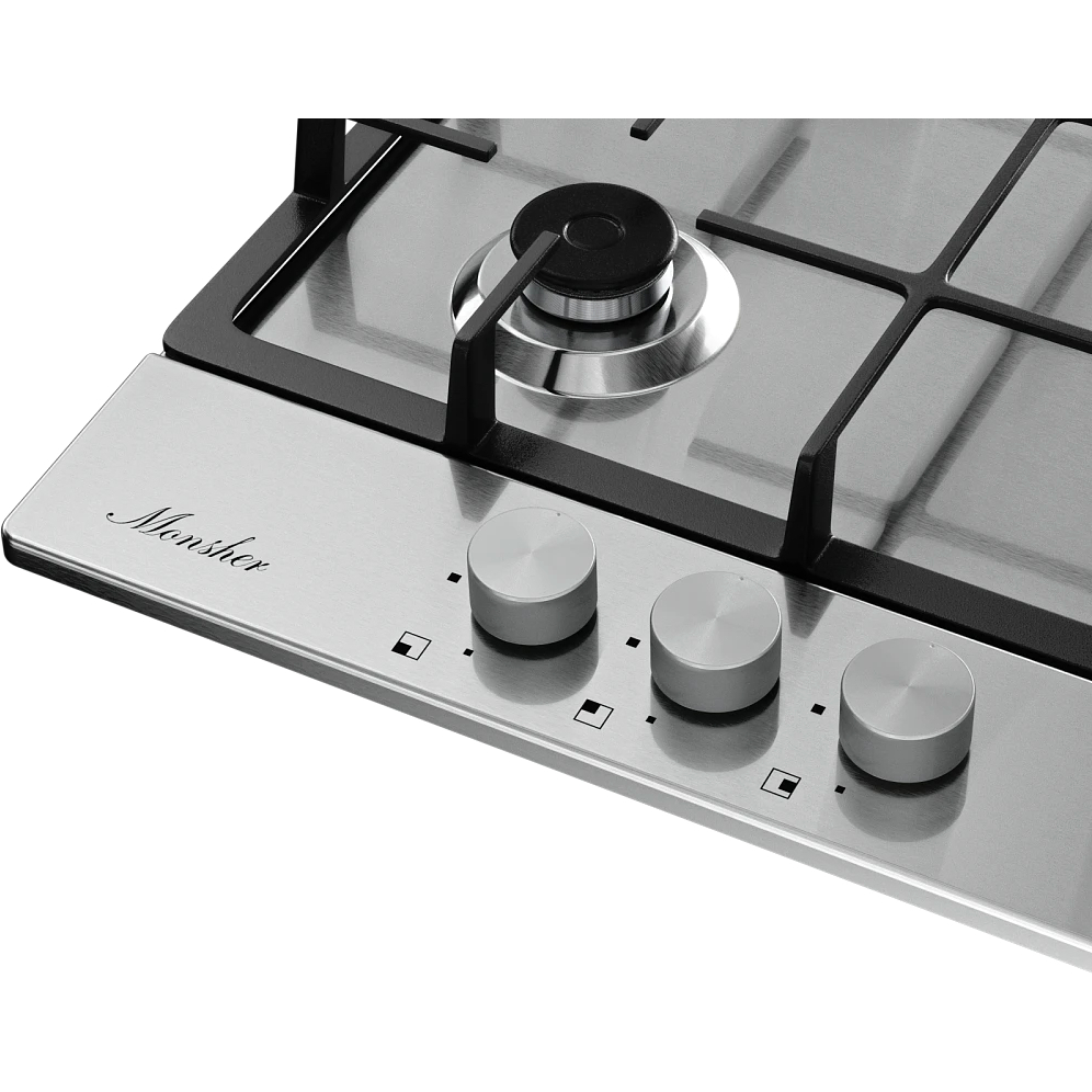 Варочная поверхность MONSHER/ Варочная поверхность MONSHER, газ, High-Tech, 44 см, автоматический электроподжиг, газ-контроль, форсунки под сжиженый газ, SABAF конфорки, чугунные решетки, цвет нержавеющая сталь