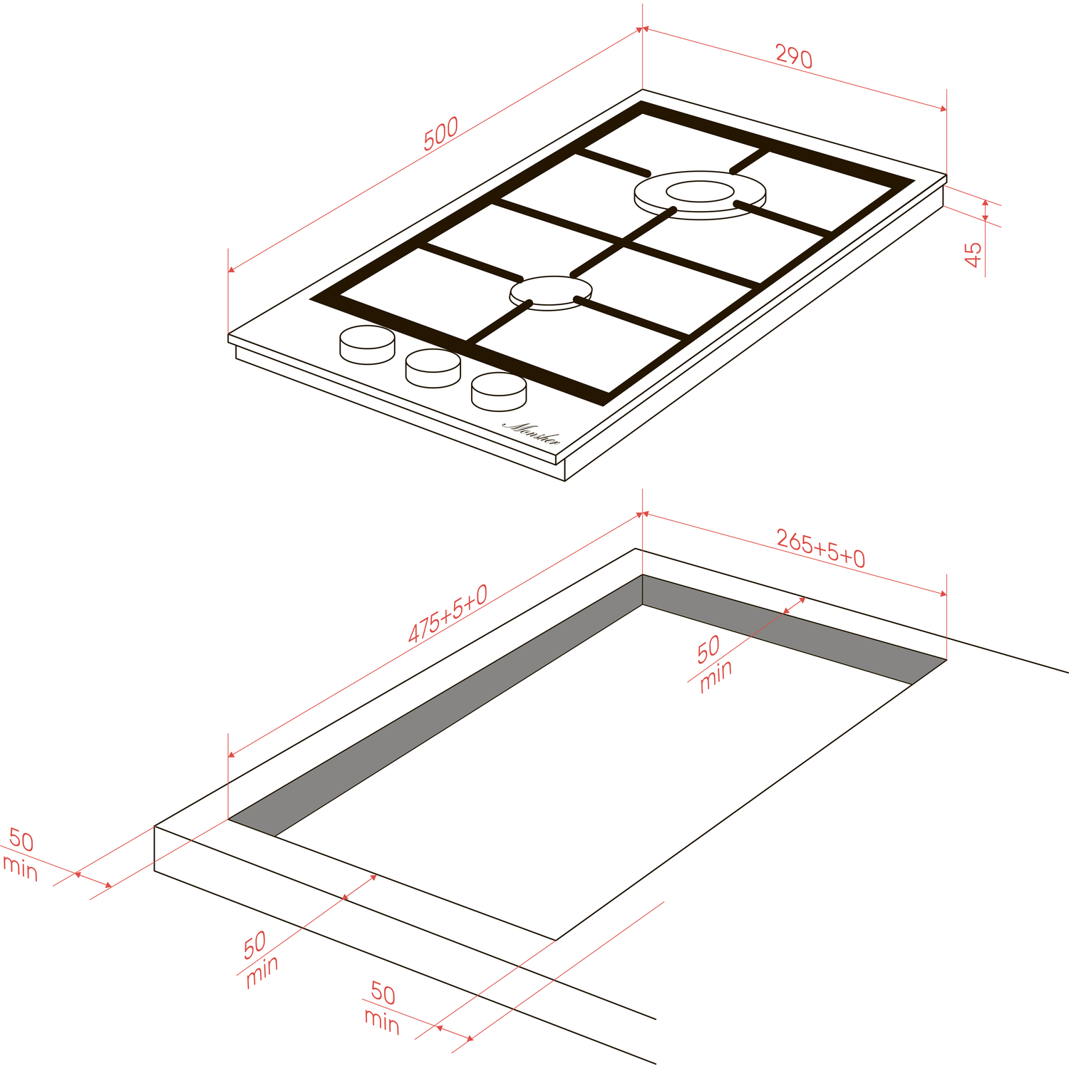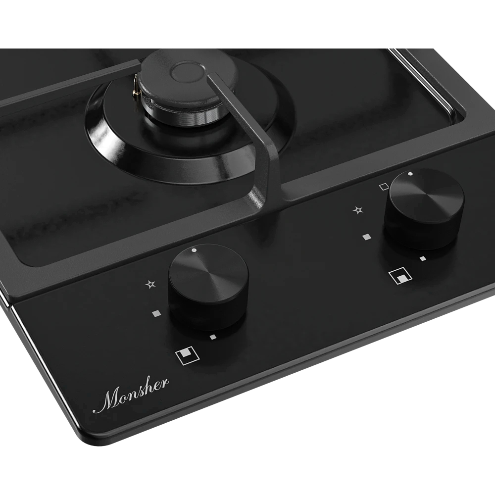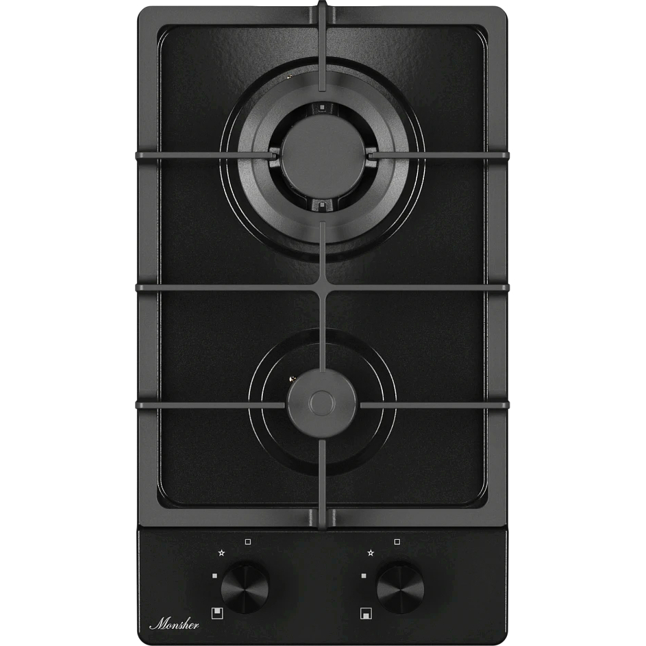 Варочная поверхность MONSHER/ Варочная поверхность MONSHER, газ, High-Tech, 29 см, автоматический электроподжиг, газ-контроль, форсунки под сжиженый газ, SABAF конфорки, чугунные решетки, цвет черный