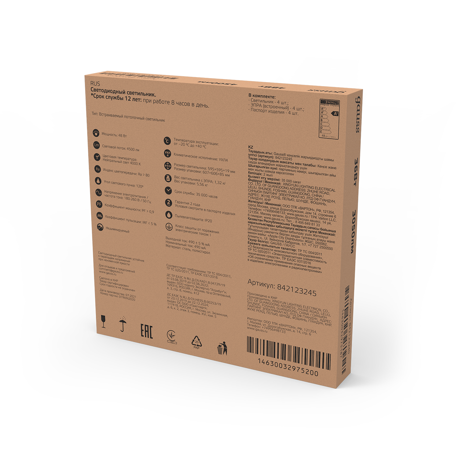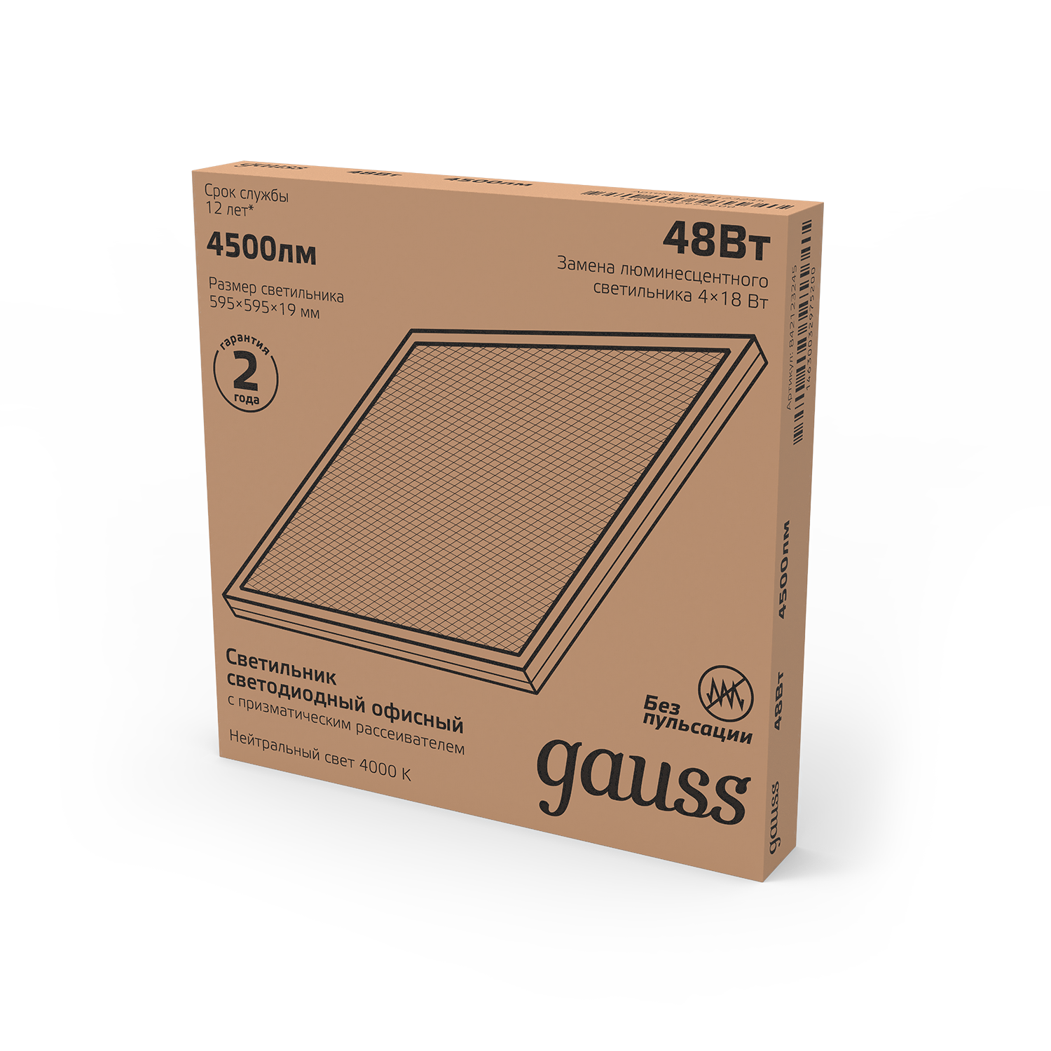 Панель светодиодная Gauss 48W 4500lm 4000K IP20 595x595x19мм призма LED / 842123245