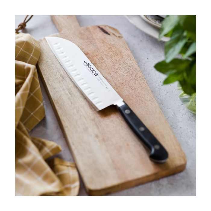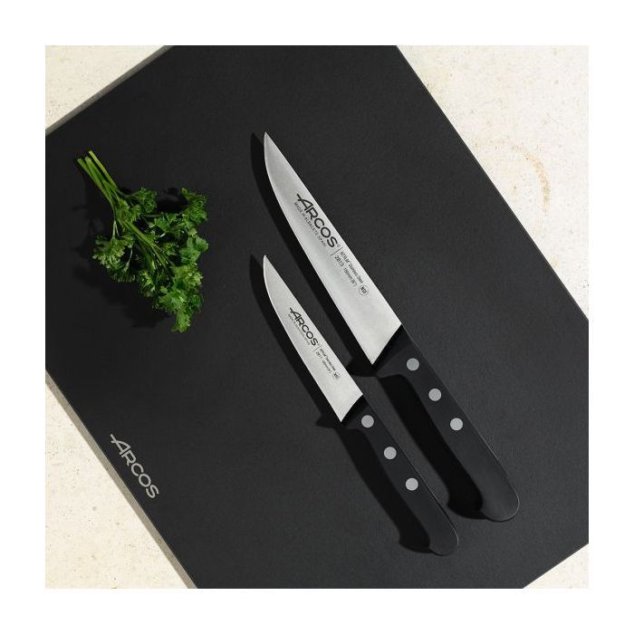 Ніж для чищення Universal від іспанського виробника Arcos виготовлений із кованої сталі NITRUM , яка є ексклюзивним винаходом компанії. Вона збагачена азотом і тому довговічна, несприйнятлива до корозії і довго не вимагає заточування. Не менш технологічна руків'я з поліпропілену . Інноваційний матеріал має дивовижні ударостійкі властивості. У цій моделі застосований двосторонній симетричний тип заточування. Завдяки цьому гострота ножа практично ідеальна, а початкова ріжуча здатність зберігається триваліший час.
