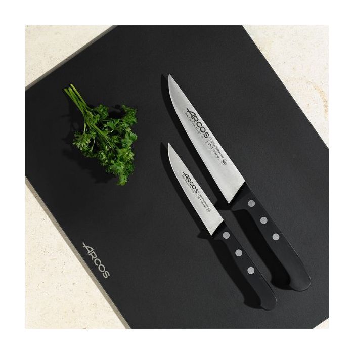 Ніж для чищення Universal від іспанського виробника Arcos виготовлений із кованої сталі NITRUM , яка є ексклюзивним винаходом компанії. Вона збагачена азотом і тому довговічна, несприйнятлива до корозії і довго не вимагає заточування. Не менш технологічна руків'я з поліпропілену . Інноваційний матеріал має дивовижні ударостійкі властивості. У цій моделі застосований двосторонній симетричний тип заточування. Завдяки цьому гострота ножа практично ідеальна, а початкова ріжуча здатність зберігається триваліший час.