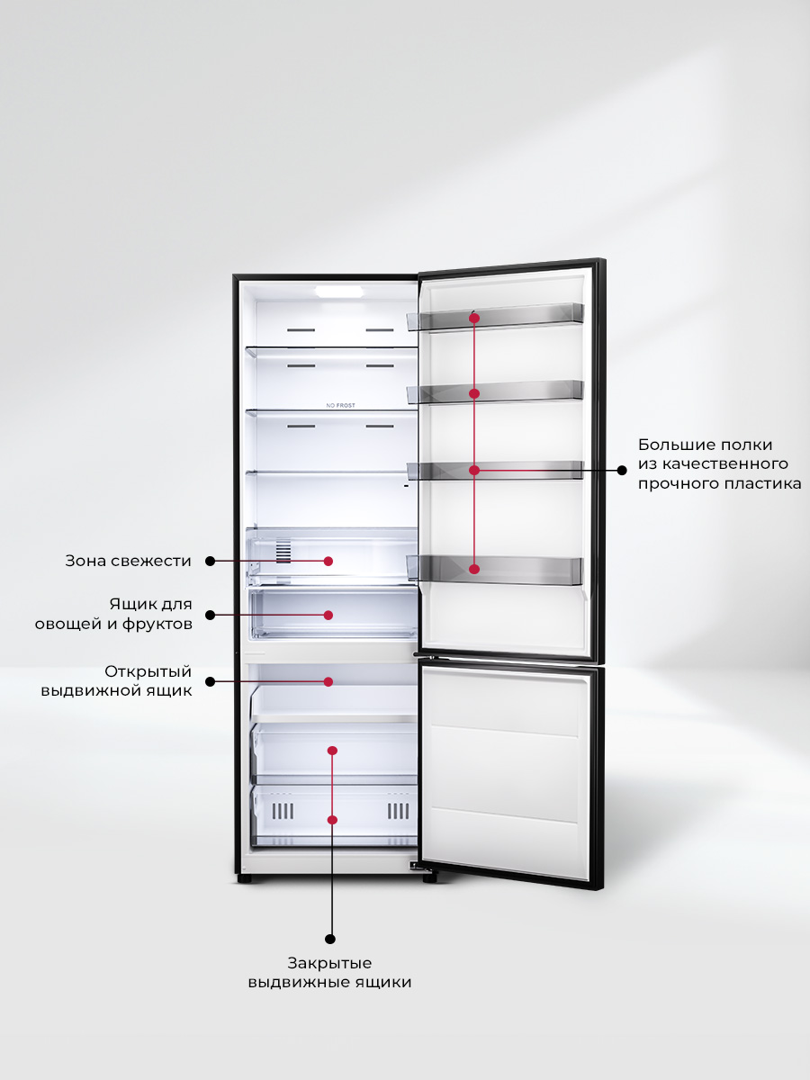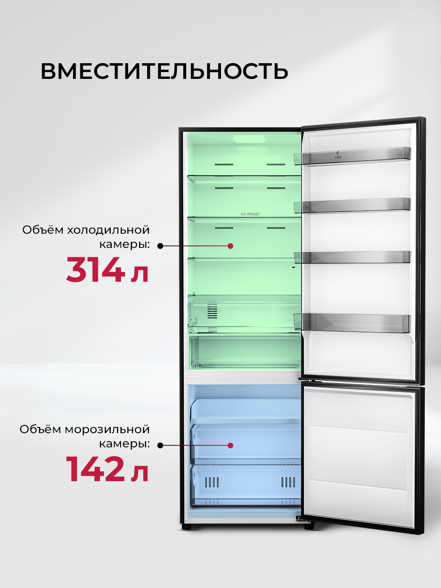 Два отделения с полезным объемом 456 литров дают возможность хранить все блюда и напитки на удобном уровне. Внутреннее пространство холодильника организовано максимально эффективно благодаря регулируемым полкам.