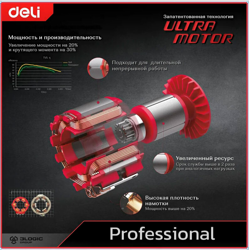 • Дополнительные функции блокировка включения, фиксация шпинделя, быстрая замена щеток, защита от перегрева