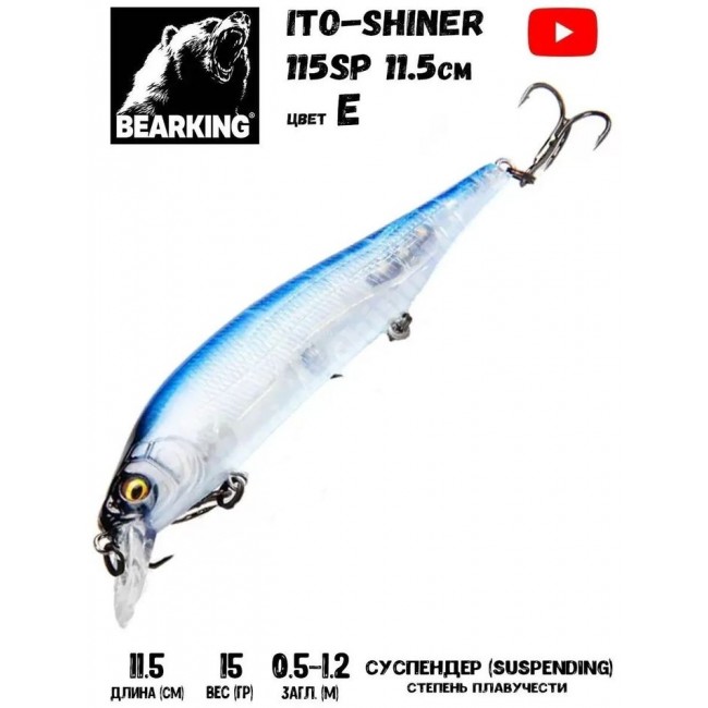Воблеры минноу BearKing Ito Shiner 115SP 15гр 0,5-1,2м (копия Megabass Ito Shiner 115SP) - искуственные приманки (приманка для рыбалки, приманки на хищника, приманки на щуку, приманки на окуня). является визитной карточкой компании Bearking. Реплика получилась настолько уловистой, что сразу затмила своим появлением оригинал, что, не удивительно учитывая разницу в цене, которая в пять раз ниже одноименной приманки для рыбалки от компании Мегабасс. Длина воблера - 115 мм, вес - 15 грамм, заглубление от 0,5 до 1,2 метра, плавучесть — нейтральная (суспендер). Воблер Беркинг Ито Шайнер имеет систему дальнего заброса (Triple Tungsten Weight Oscillate System), которая состоит из трех вольфрамовых шаров, которые благодаря своему меньшему диаметру (по сравнению с традиционными системами из двух шаров) могут дальше смещаться в хвостовую часть и тем самым значительно увеличивать дальность заброса. Лучший способ анимации рыболовные приманки Ито Шайнера — это рывковая проводка (твичинг), при которой воблер для рыбалки совершает размашистые глайды и долго роллит на паузе. Данные приманки рыболовные отлично выкашивает щуку от шнурков до трофейных экземпляров. Приманка для рыбы BearKing Ito Shiner это шикарные воблеры на окуня, воблеры на судака, воблеры на щуку. У нас есть большой ассортимент цветов данной модели вы сможете создать удивительный набор воблеров для рыбалки.