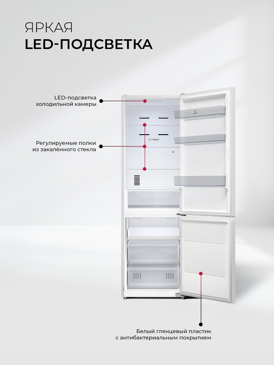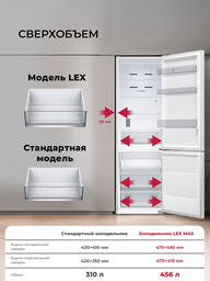 LED-лампы обеспечивают яркий свет, помогая вам быстро найти все, что нужно. Электронная панель управления делает настройку параметров интуитивно понятной. А перенавешиваемые двери делают холодильник LEX LKB201 универсальным для любой кухни.
