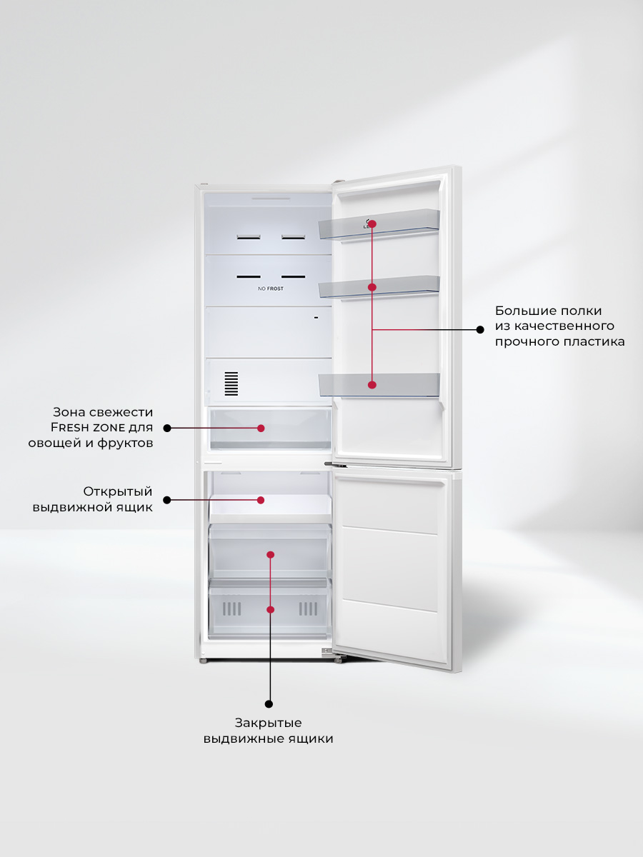 Холодильник LEX LKB201 оснащен современным инверторным компрессором, который гарантирует эффективную и практически бесшумную работу. Он также обеспечивает низкий расход энергии и долго поддерживает температуру без электропитания. Технология Total No Frost значительно упрощает обслуживание и помогает устанавливать оптимальную температуру и влажность.