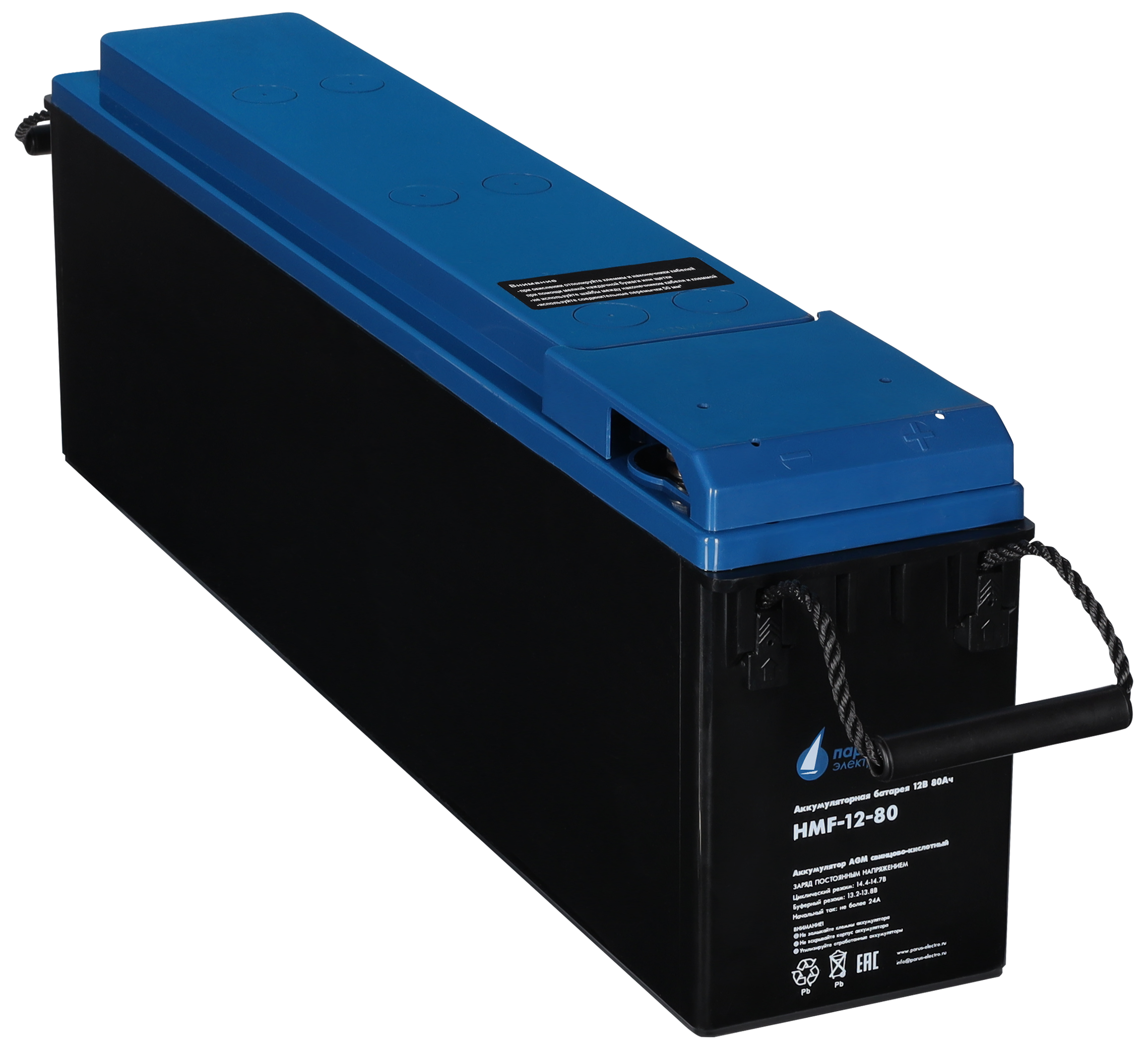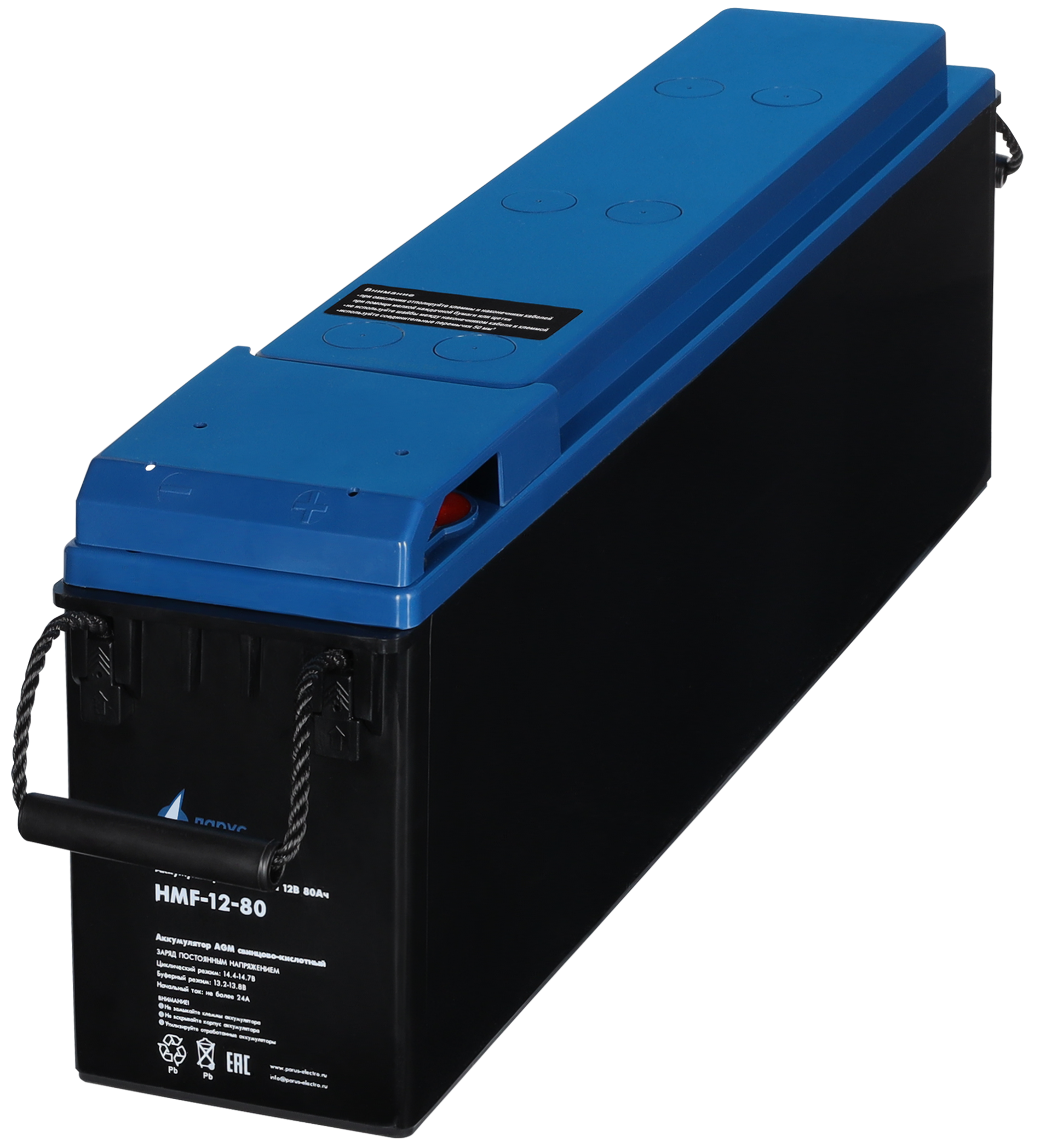 Battery Parus Electro, specialized series HMF-12-80, voltage 12V, capacity 80Ah (discharge 10 hours), max. discharge current (5sec) 800A, max. charge current 24A, lead-acid type AGM, bolt terminals M8, LxWxH 564x115x189mm., full height with terminals 189mm., weight 28.2kg., service life 12 years.