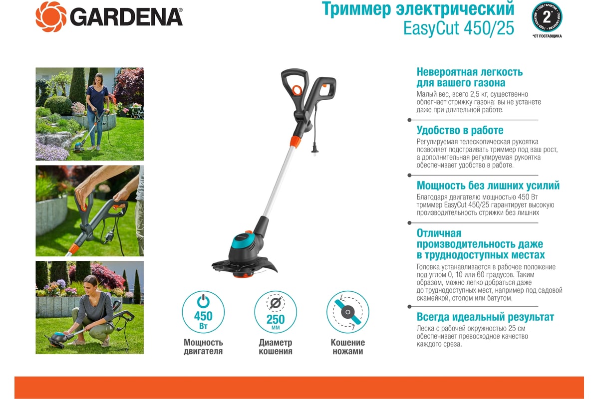 Электрический триммер Gardena EasyCut 450/25 09870-20.000.00 позволяет эффективно ухаживать за газоном на приусадебных участках. Не требует сборки, поэтому можно сразу приступать к работе.