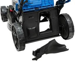• Двойная защита от случайного пуска требует сдвига бокового рычага блокировки - только после этого становится возможным запуск основным рычагом, а также предварительной активации кнопки питания, что полностью исключает непреднамеренное включение газонокосилки.