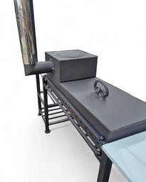 • Материал сталь (Ст3 5 мм + нитроэмаль термостойкая эмаль + патина), нержавеющая сталь (столешница), дерево (ольха — скамья)