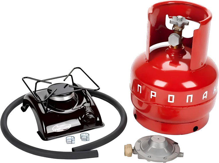 - Комплектация баллон, шланг (+ хомуты), инструкция, плита