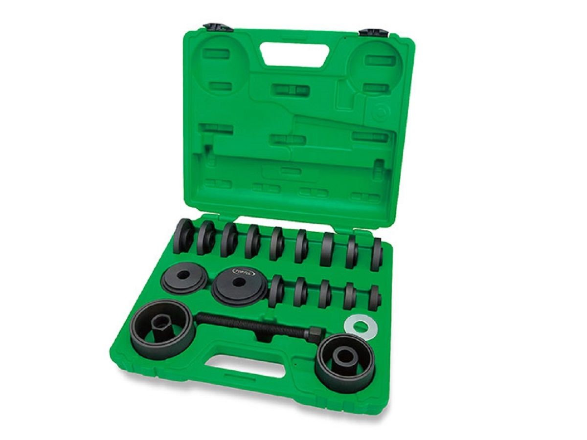 Универсальный набор для снятия и установки передних подшипников ступицы. С помощью данного набора возможна замена передних подшипников ступицы без необходимости демонтажа поворотного кулака и стойки в сборе. Применяется для переднеприводных автомобилей и легких грузовиков. Специальное черное фосфатное покрытие для защиты от коррозии.
