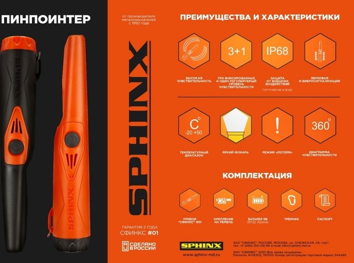 - Особенности вибрация, настройка чувствительности/глубины, пинпоинт, фонарик