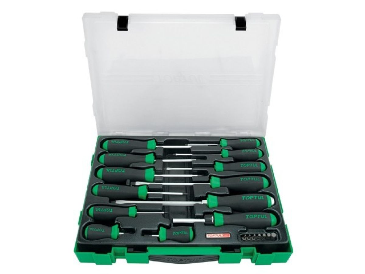 Набор отверток и бит TOPTUL 20 предметов (GZC2005) используется квалифицированными специалистами различных сфер промышленности. Цельнозакаленные жала отверток изготовлены из конструкционной легированной стали и оснащены магнитным наконечником. Двухкомпонентная рукоятка держателя: термопластичный каучук и полипропилена гарантирует удобство в работе и предотвращает проскальзывание инструмента в руке. Набор включает 20 предметов: шлицевые отвертки, крестообразные (PH, PZ), держатель бит и сет бит из семи штук. Одна из отверток ударная. Поставляется в пластиковом боксе.