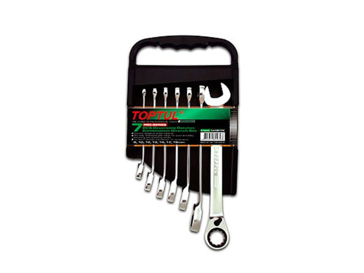 Набор ключей комбинированных с трещоткой PRO SERIES TOPTUL состоит из 7 предметов размером 8, 10, 12, 13, 14, 17 и 19 мм серии ABAF0808-1919, имеющих окончание в виде рожкового ключа с одной стороны и окончание в виде накидного ключа-трещотки с другой стороны. Механизм храповика имеет переключатель и способен работать как на зажим, так и на отворот. Набор оснащен удобным пластиковым держателем-переноской.