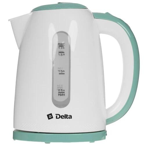 Электрочайник DELTA DL-1106 голубого цвета изготовлен из пластика и имеет скрытый нагревательный элемент из нержавеющей стали. Прибор автоматически отключается при нагревании и блокируется при отсутствии воды. Модель может нагревать воду до 100°C.
