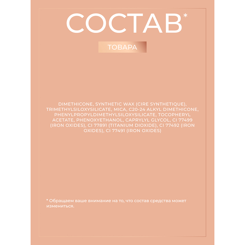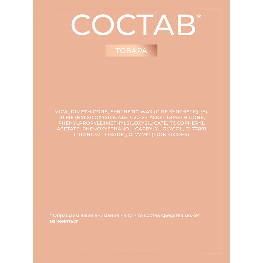 MICA, DIMETHICONE, SYNTHETIC WAX (CIRE SYNTHETIQUE), TRIMETHYLSILOXYSILICATE, C20-24 ALKYL DIMETHICONE, PHENYLPROPYLDIMETHYLSILOXYSILICATE, TOCOPHERYL ACETATE, PHENOXYETHANOL, CAPRYLYL GLYCOL, CI 77891 (TITANIUM DIOXIDE), CI 77492 (IRON OXIDES).