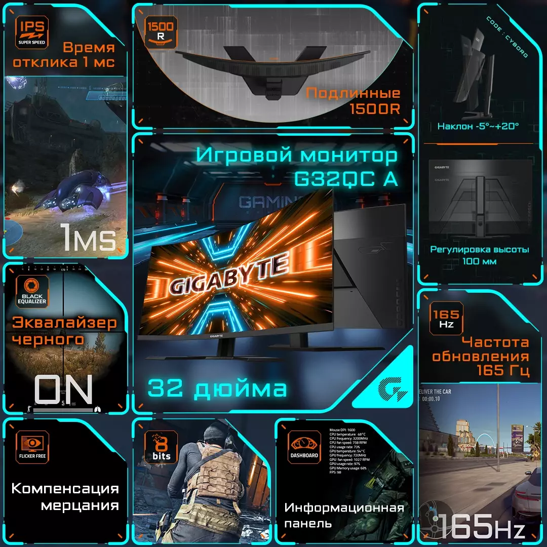 Монитор 31.5" Gigabyte G32QC A, 2560х1440, 165 Гц, VA, черный (9dgg32qca-00-3abek)