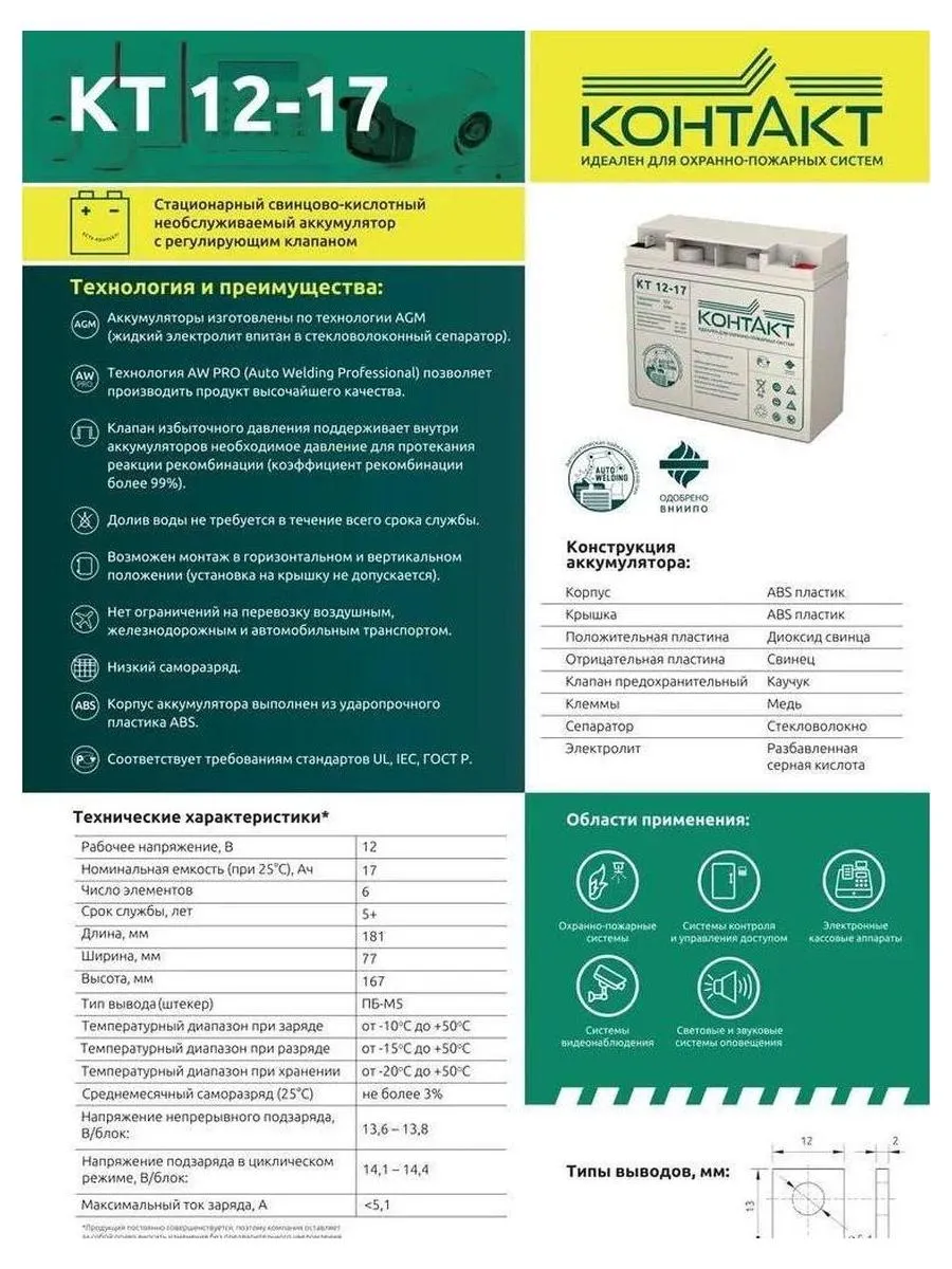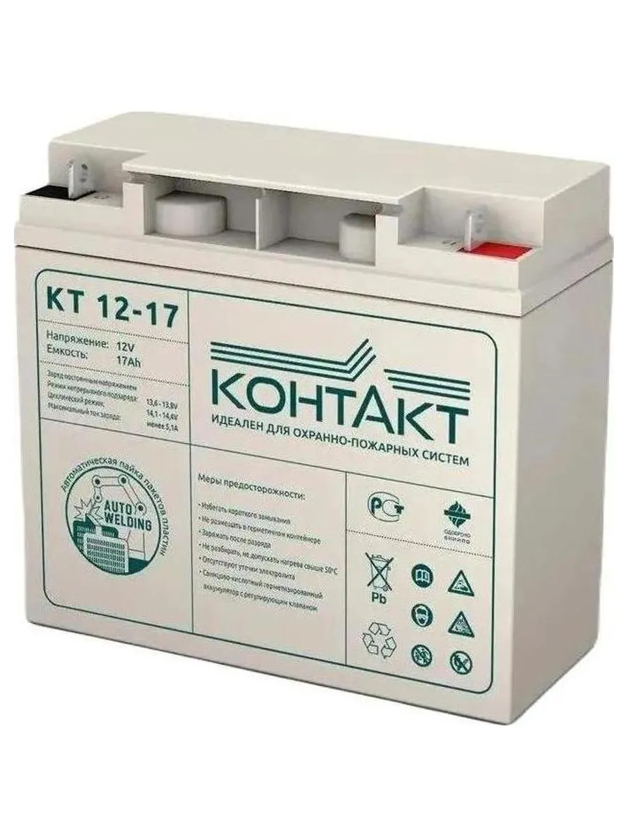 Свинцово-кислотная герметизированная аккумуляторная батарея Контакт КТ 12-17, с напряжением 12 В, ёмкостью 17 Ач. Технология изготовления AGM с абсорбированным электролитом в стекловолоконном сепараторе, идеальны для использования в охранно-противопожарных, а также мелком слаботочном оборудовании. Подойдет для детских электромобилей и мотоциклов. Необслуживаемая VRLA батарея производителя Контакт- лучшее соотношение цены и качества, оптимальны для использования как в циклическом, так и в буферном режиме, но буферный режим эксплуатации более предпочтителен. Расчетный срок службы 5 лет.