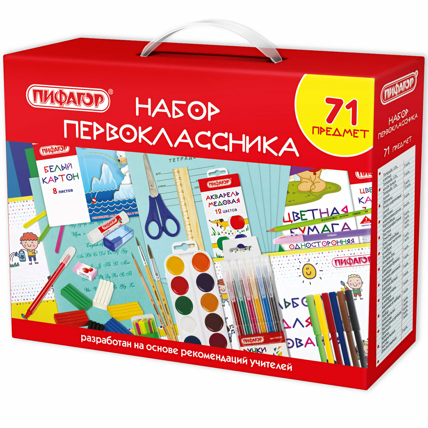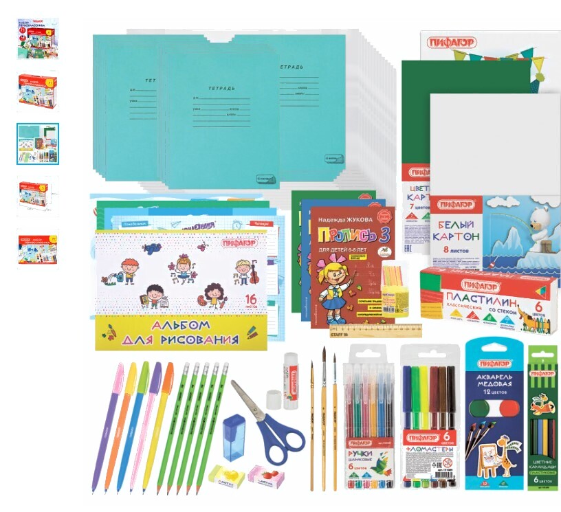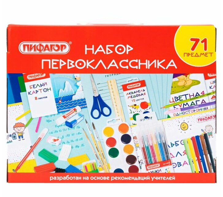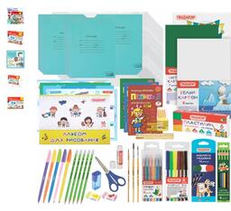 - Наполнение клей, точилка, ластик, линейка, счетные палочки, альбом для рисования, тетраль в линейку, тетрадь в клетку, тетрадь в косую линейку, обложки для тетрадей и дневников, ручка, карандаш чернографитный, карандаши цветные, набор цветной бумаги, набор цветного картона, набор белого картона, фломастеры, пластилин, ножницы канцелярские, расписание уроков, кисть, акварель