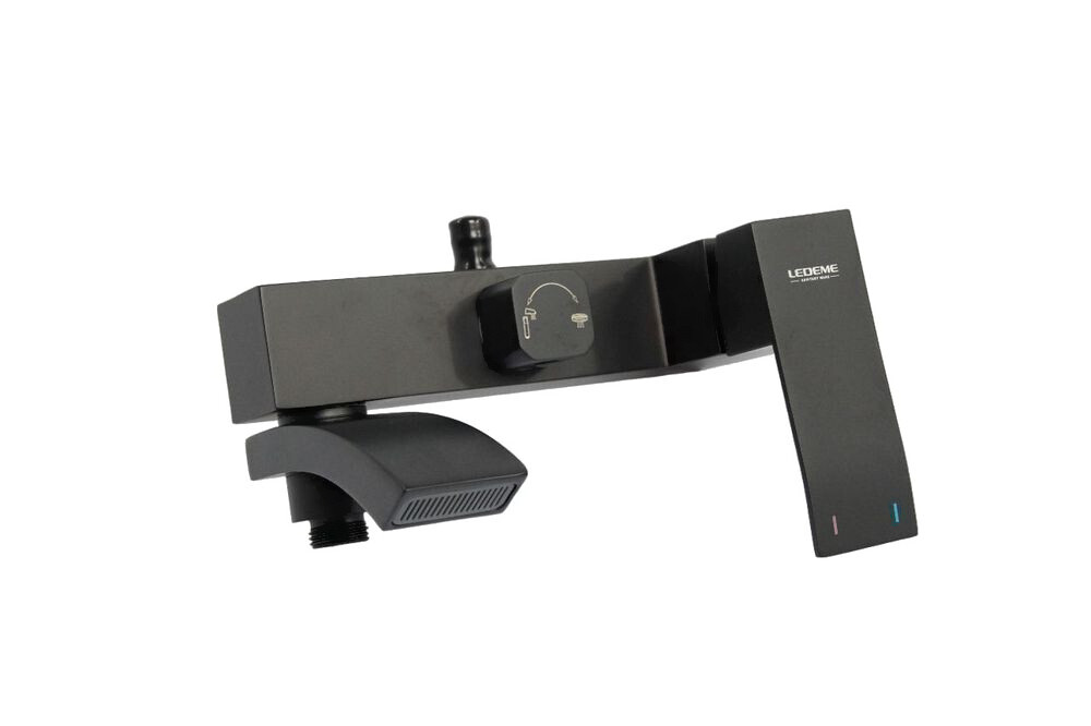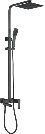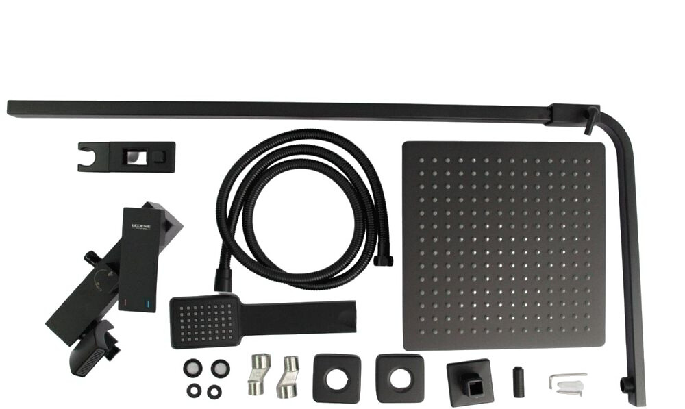 • В комплекте верхний душ, душевой шланг, держатель, лейка душевая, излив, штанга