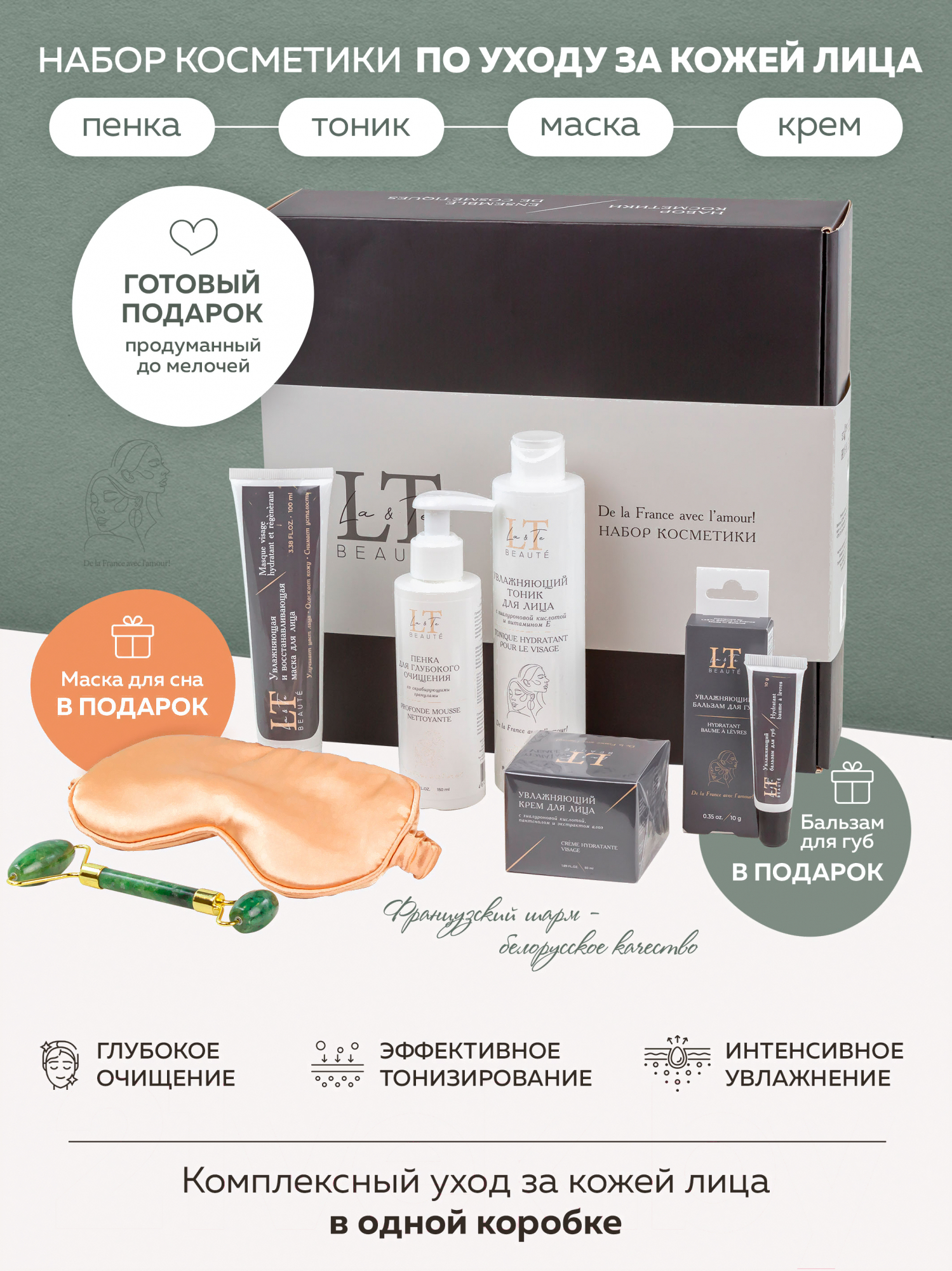 • Косметика в наборе крем для лица, тоник для лица, маска для лица, пенка для умывания, бальзам для губ