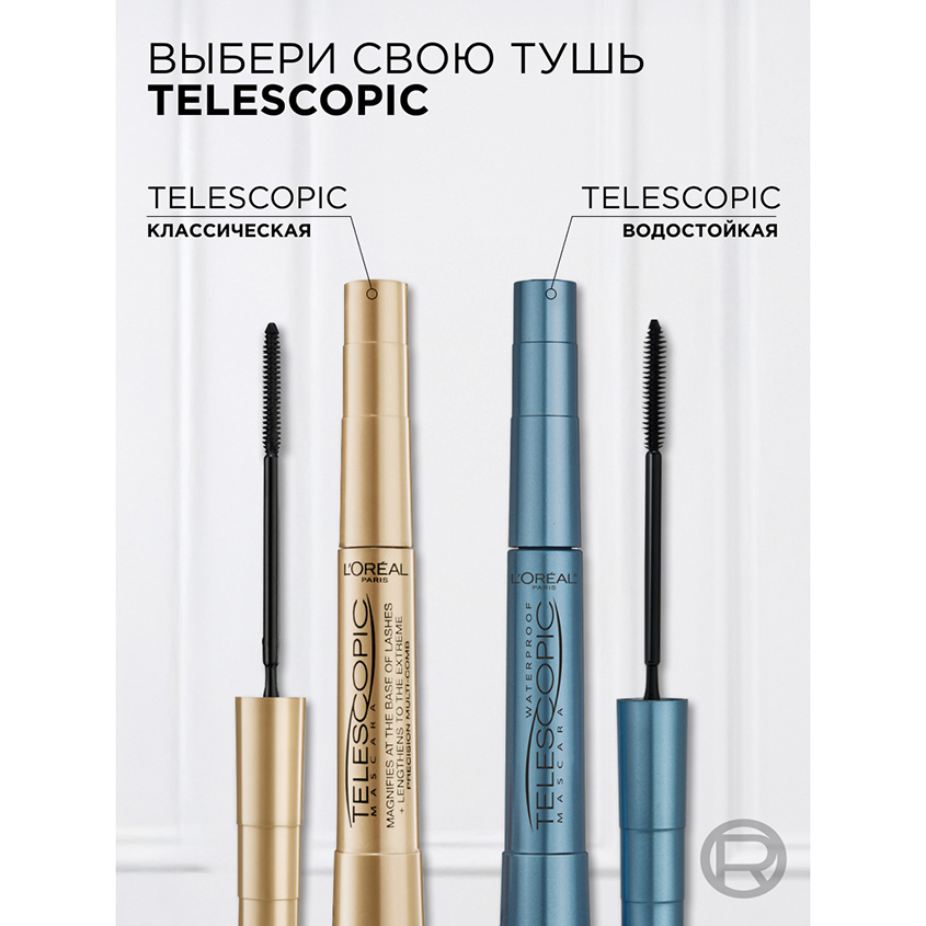 Легендарная тушь TELESCOPIC от L'Oreal Paris теперь в водостойком формате! Силиконовая щеточка-расческа разделяет и удлиняет ресницы до 50%. Формула черного и экстрачерного цветов обеспечивает беспрецедентно черное и угольно-черное покрытие. В состав формул тушей ТЕЛЕСКОПИК от Лореаль Париж входит пчелиный воск, молекулы которого придают объем и пластичность ресницам, а воск карнауба укрепляет ресницы и увеличивает стойкость туши. Тушь дарит ресницам насыщенный глубокий черный или экстрачерный цвет в зависимости от оттенка. Телескопическое удлинение и разделение ваших ресниц. Покоряй взглядом любую высоту, ведь ты этого достойна.