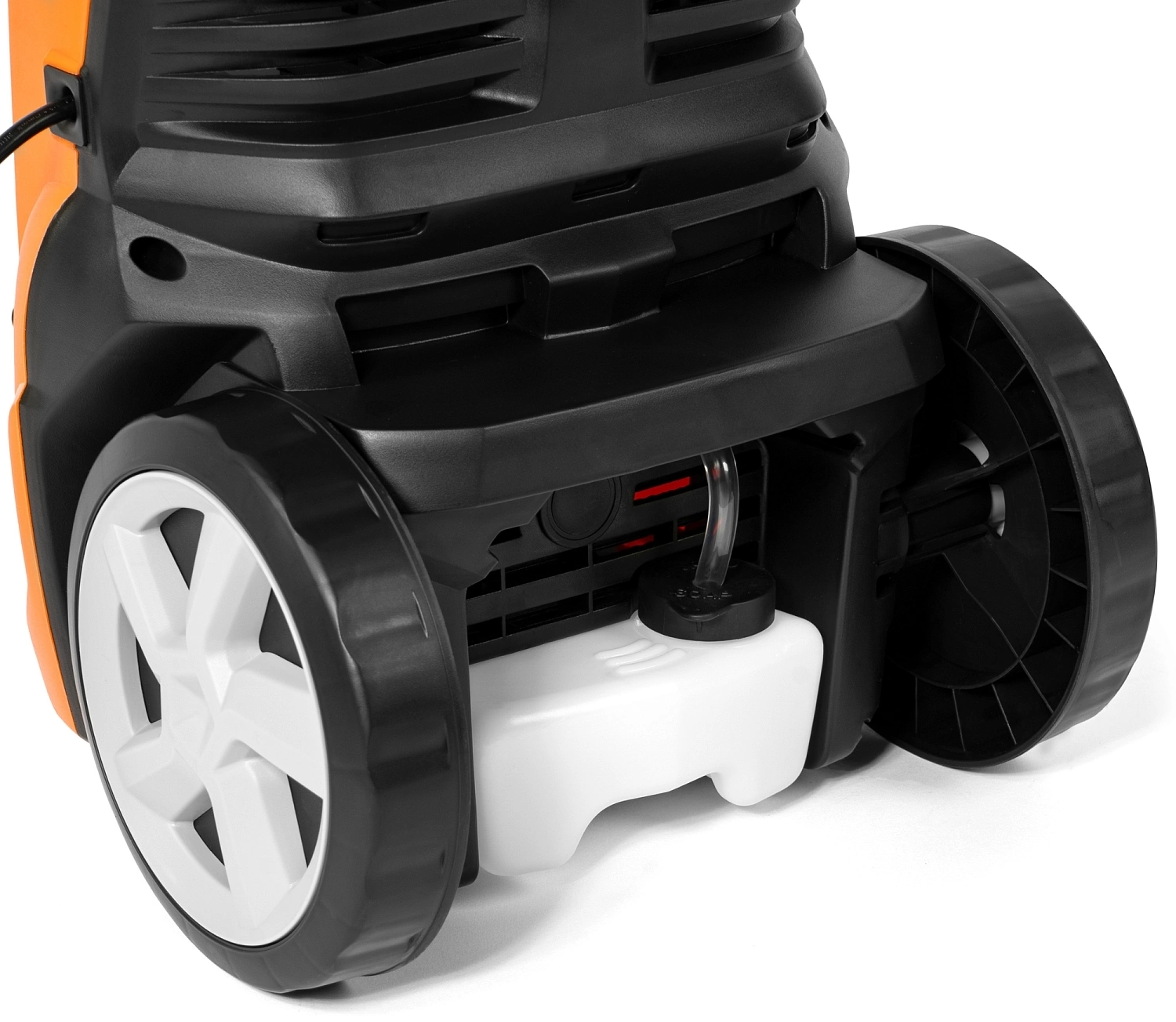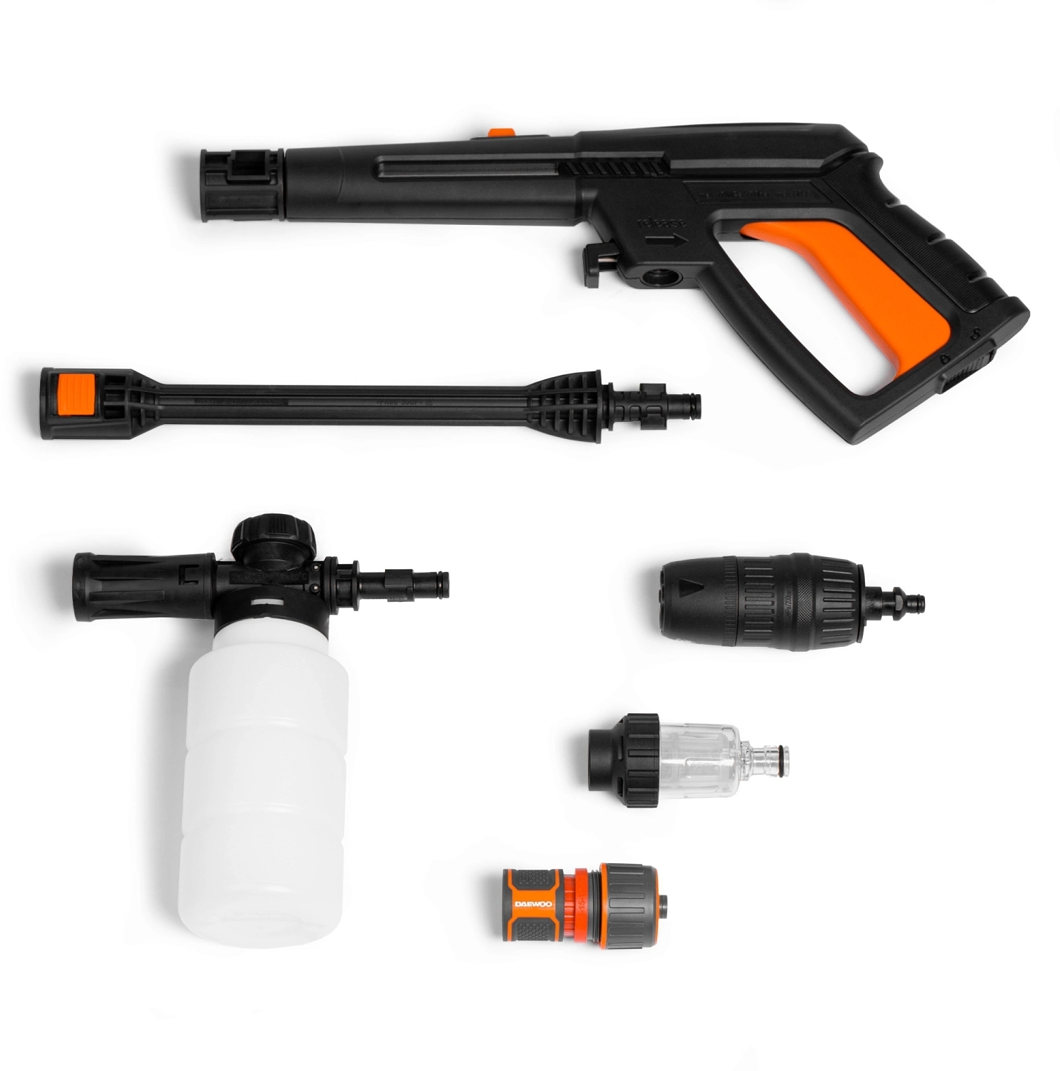 • Особенности Электрический двигатель Daewoo; Самостоятельный забор воды; Встроенная емкость для шампуня; Пеногенератор в комплекте; Грязевая фреза; Автоматическое отключение; Фильтр тонкой очистки; Алюминиевая помпа; Армированный шланг высокого давления; Гарантия Daewoo.
